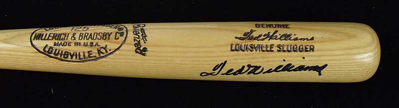 Description:Ted Williams autographed baseball bat (EX/MT-NM) Louisville Slugger 125 model bat done in similar style to that which he would have used has been signed in marker rating 8/9 out of 10. Hint of light scattered surface wear: EX/MT-NM ($400-$600)