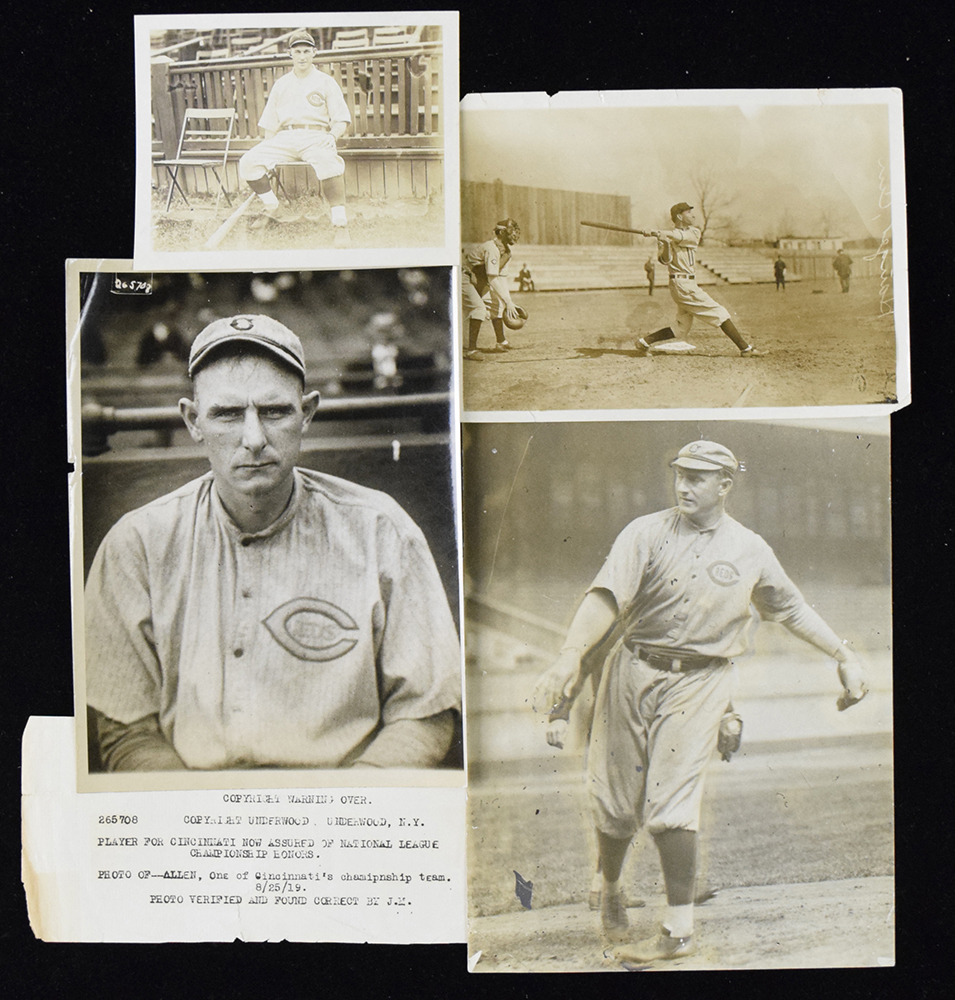 Description:Lot of (4) vintage Cincinnati Reds photographs, c.1911-29 (GD-EX/MT). Includes 5"x7" c.1911 Arthur Hauger photo (GD), 6.5"x8.5" c.1916 Fred Toney photo (VG), 6"x8" c.1919 Nick Allen photo by Underwood & Underwood (VG), and 4"x5" c.1926-29 Chuck Dressen photo (EX/MT).