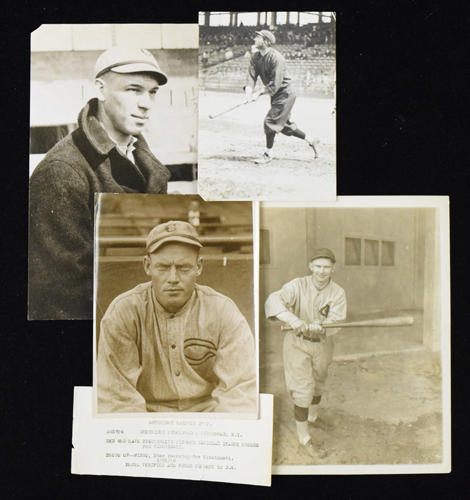 Lot of (4) vintage Cincinnati Reds photographs, c.1913-28 (GD-VG/EX). Includes 5"x7" c.1913 Johnny Kling photo (VG), 6.25"x10.5" c.1917 Ed Gerner photo (VG), 6"x8" c.1919 Ivey Wingo photo (VG/EX), and 8"x10" c.1928 Pid Purdy photo (GD tape repaired tear).