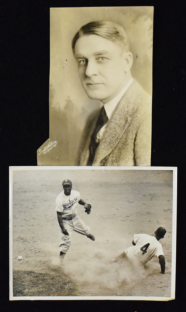Description:Branch Rickey and Jackie Robinson vintage photographs (GD/VG-VG). Includes approx. 6.75"x9.5" c.1926 Branch Rickey portrait by Sid Whiting with "SEP 25, 1926" date stamp on the back (VG), and 8"x10" Jackie Robinson action photo with "APR 18, 1950" date stamp and paper caption on the back (G/VG-VG).