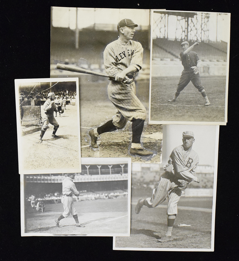 Description:Lot of (5) vintage baseball photographs by Conlon, Bain, and Thompson (VG/EX-EX). Includes 5"x7" c.1907-09 George Gibson photo by Paul Thompson (VG/EX), 5"x7" c.1911 Al Bridwell photo by Paul Thompson (VG/EX), 6.5"x8.5" c.1914-15 Jeff Pfeffer photo by Paul Thompson (EX), 7"x9.5" c.1918 Jack Graney photo by Charles Conlon (VG/EX-EX), 4"x6" c.1918-19 Tom Daly photo by George Grantham Bain News Service (EX).