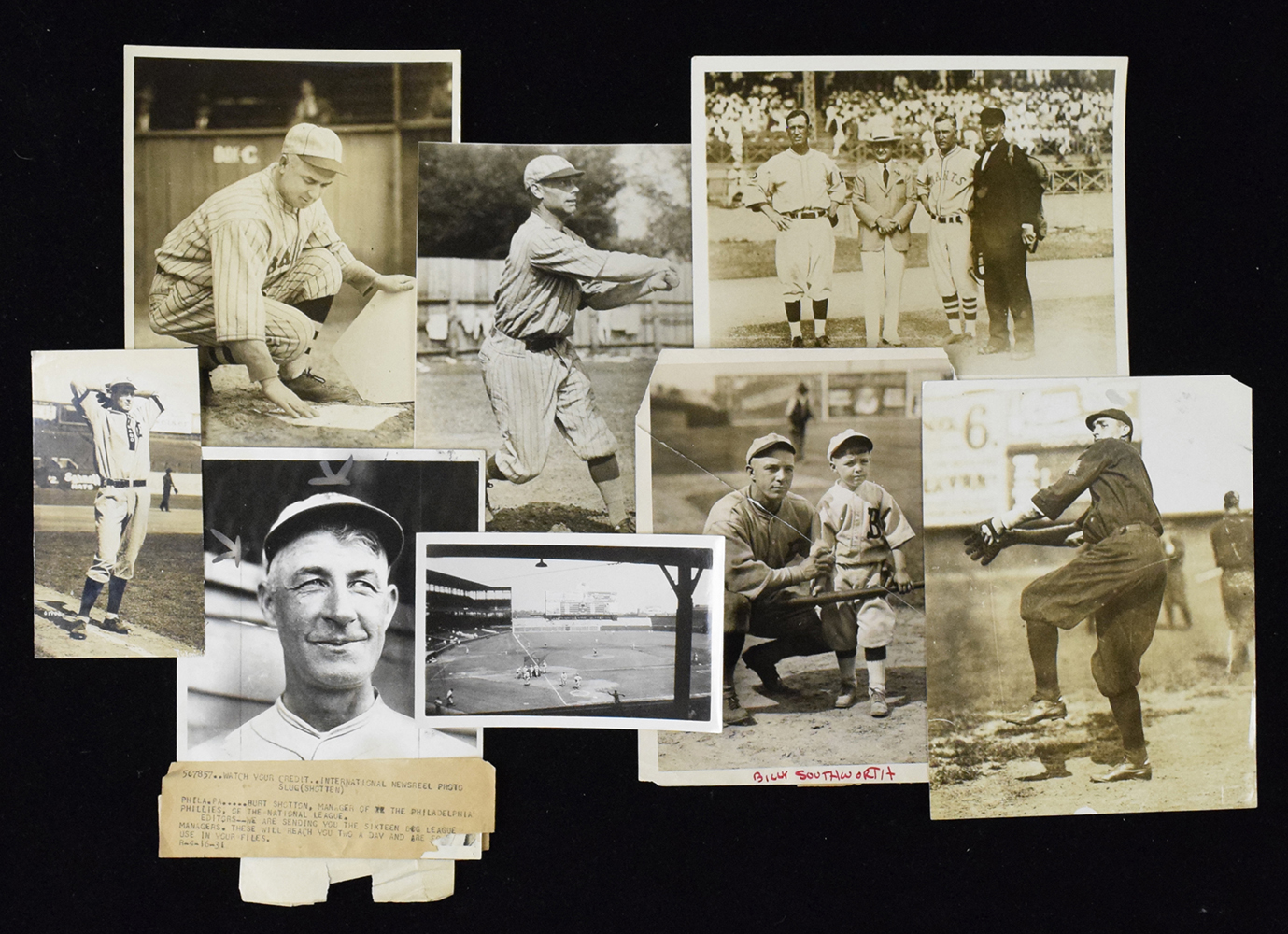 Description:Lot of (8) vintage baseball photographs, c.1909-1938 (PR/FR-EX/MT). Includes 3.25"x6" c.1909 Rip Hagerman photo by Pictorial News Co. (VG/EX-EX); 6.5"x8.5" c.1913-15 Bill James photo (G/VG); 6.5"x8.5" c.1921-24 International photo picturing Billy Southworth and his son (PR/FR, torn and taped back together); 6"x8" c.1924 Heinie Sand photo by Underwood & Underwood (EX-EX/MT); 6.5"x8.5" c.1926 Art Devlin photo by Pacific & Atlantic (G/VG-VG); 6.5"x8.5" c.1930 Underwood & Underwood photo picturing Dave Bancroft, Jewel Ens, Ted McGrew, and Julio Blanco Herrera at the Little World Series in Cuba (EX); 6"x8" c.1931 Burt Shotton photo by International (VG); and 3.75"x6" c.1938 photo picturing Sportsman's Park during batting practice prior to a game (EX-EX/MT).