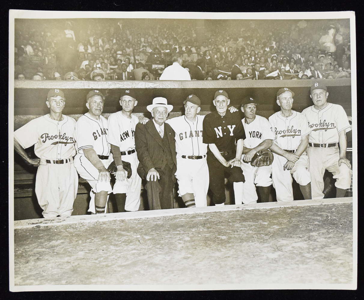 Description:Old Timers Day at the Polo Grounds photograph, c.1944 (EX). 8"x10" photo picturing Zack Wheat, Larry Doyle, Herb Pennock, Bill Klem, Roger Bresnahan, Hooks Wiltse, Wally Schang, Otto Miller, and Nap Rucker posed standing in the dugout. Minor age/handling wear mainly at the corners: EX