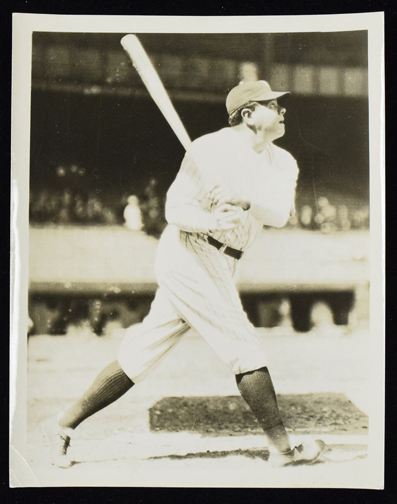Description:Babe Ruth vintage 8"x10" photograph (VG/EX). Later generation photo (likely not from the period) picturing a classic image of Ruth's swing follow-through. Blank back. Light crazing to the glossy surface, and minor creasing near the corners: VG/EX