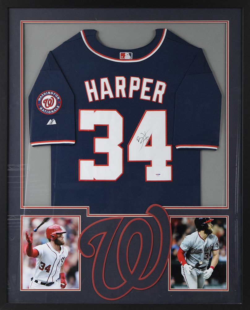 Description:Bryce Harper signed Washington Nationals jersey in framed display - PSA/DNA (NM). Approx. 34"x42" framed display containing a Nationals #34 Bryce Harper jersey by Majestic signed by Harper in black marker. Signature rates 8 out of 10. PSA/DNA serial #ed sticker is on the jersey. Due to framing, complete condition is unknown: NM appearance