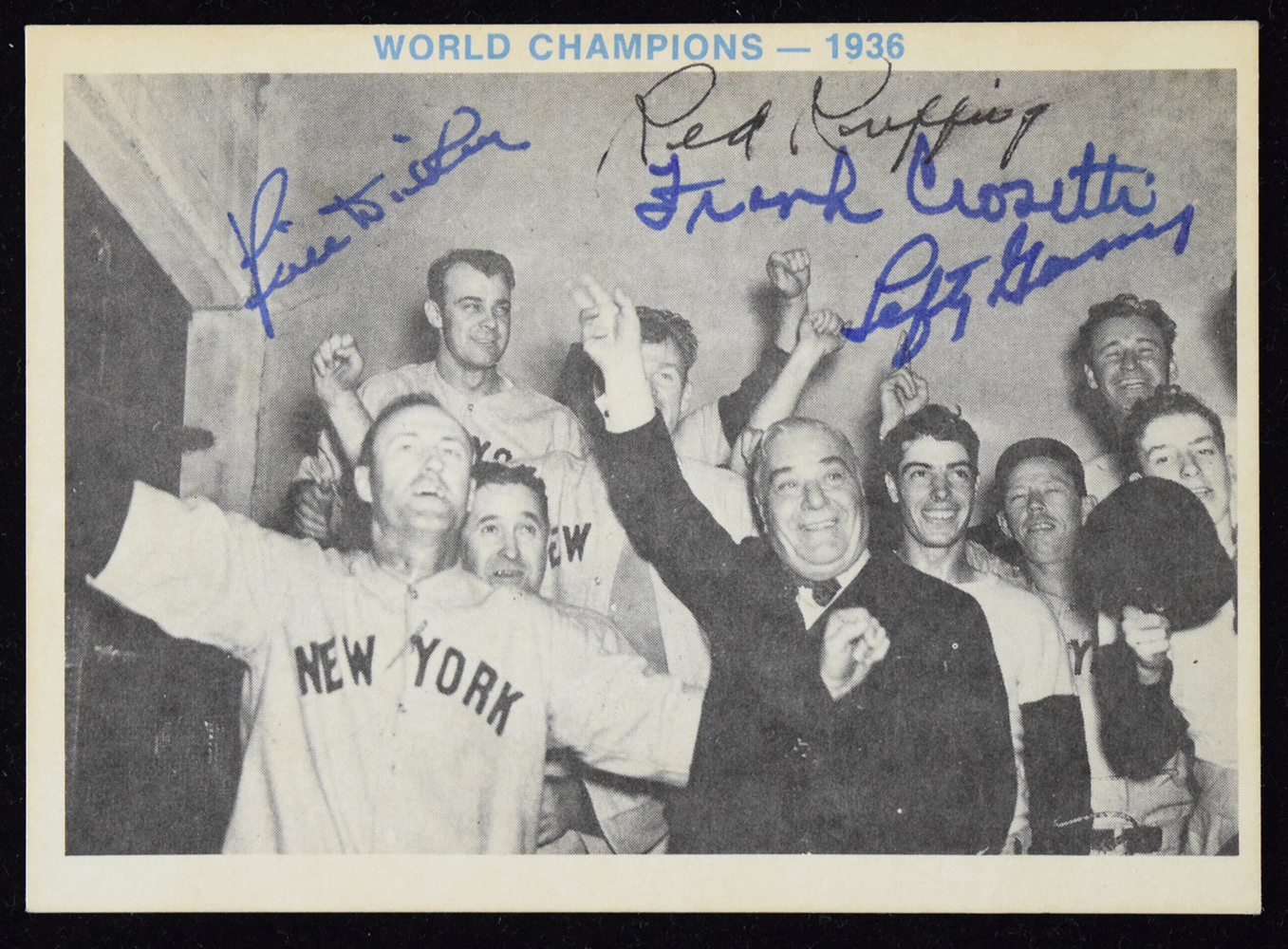 Description:Bill Dickey, Red Ruffing, Lefty Gomez, Frank Crosetti multi-signed 4"x5.5" TCMA baseball card - JSA (EX/MT). Ruffing signed the card in black fine tip marker and Dickey, Gomez, and Crosetti signed in blue marker. Signatures rate 7/8 (Ruffing) to 10 (avg 9) out of 10. Includes full LOA from JSA. Minor corner wear: EX/MT