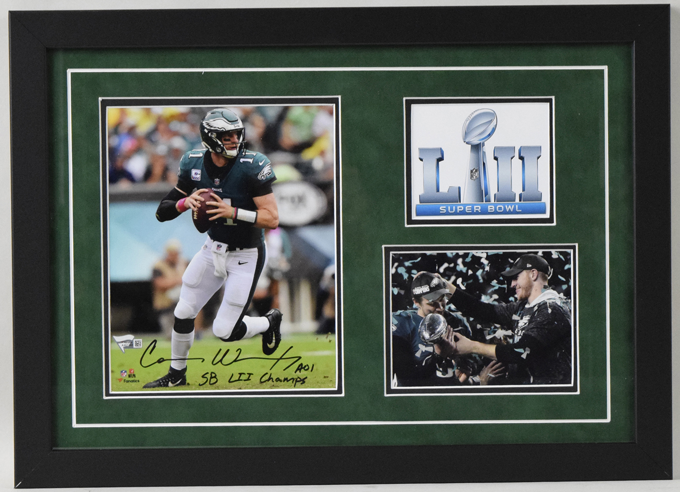 Description:Carson Wentz signed and inscribed framed display piece - Fanatics (NM). 16"x22" framed display containing a photo signed by Wentz in silver marker with "SB LII Champs" inscription. Signature rates 9/10 out of 10. Fanatics serial #ed hologram sticker is on the photo. Due to framing, complete condition is unknown: NM appearance