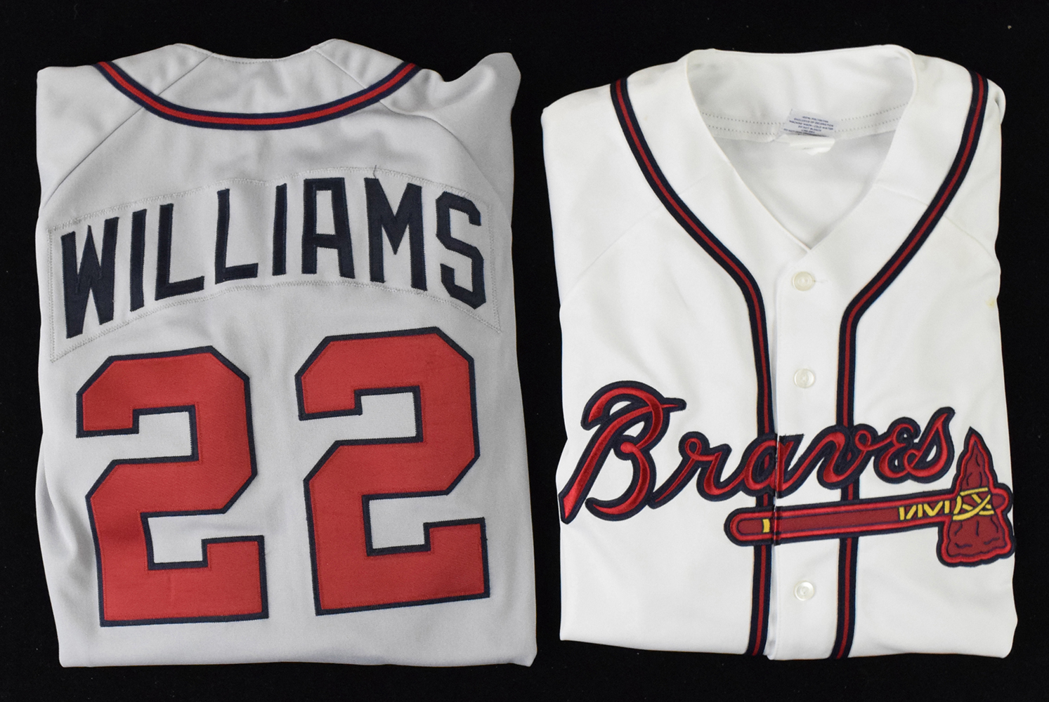 Description:1992 Jimy Williams professional model Atlanta Braves jersey, plus additional jersey (EX-EX/MT). Wilson size 44 jersey with "Atlanta" and tomahawk sewn across the front, along with "WILLIAMS" nameplate and #22 sewn on the back. Wilson tagging and "92" year tag are sewn on the front tail (EX-EX/MT light overall use/wash wear). Also includes Majestic size 3XL Braves jersey (scattered stains).