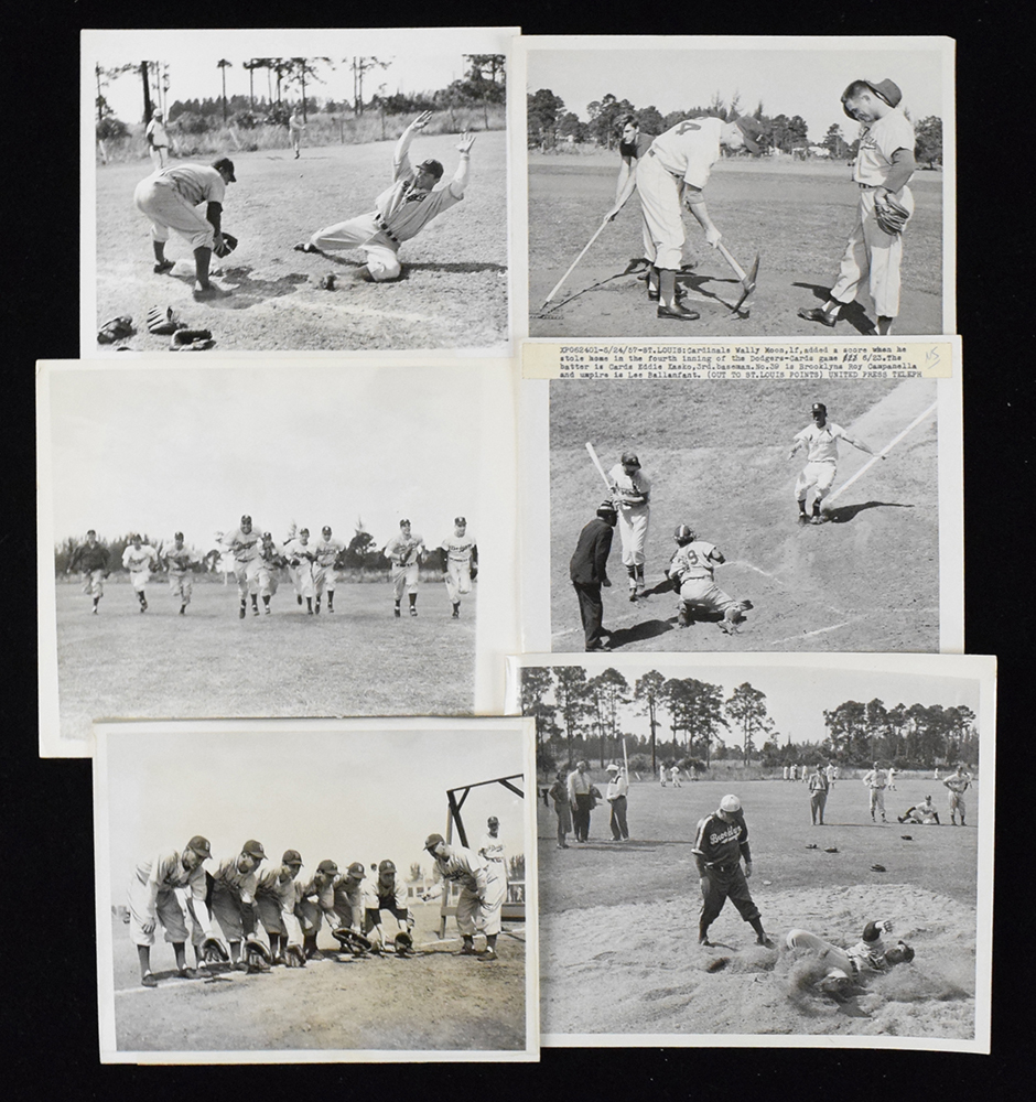 Description:Lot of (9) vintage Brooklyn Dodgers photographs, c.1942-1957 (VG-EX/MT). Includes 7.25"x9" c.1942 Mickey Owen photo by ACME; 7.25"x9" c.1949 International News photo picturing Pee Wee Reese and Buddy Hicks; 7"x9" c.1949 International News photo picturing Milt Stock instructing players; 8"x10" c.1949 International News photo picturing Carl Furillo, Gene Hermanski, Mike McCormick, and Marv Rackley; 8"x10" c.1949 International News photo picturing players running during spring training; 8"x10" c.1949 International News photo picturing Branch Rickey Jr and Bruce Edwards; 7"x9" c.1954 International News photo picturing Walter Alston and Clem Labine; 7.25"x9" c.1954 International News photo picturing Joe Black and others admiring an Abraham Lincoln statue; 7.25"x9" c.1957 United Press photo picturing Roy Campanella and Wally Moon in a play at the plate. Most appear to average VG/EX-EX overall with normal age/handling wear. Range: VG-EX/MT