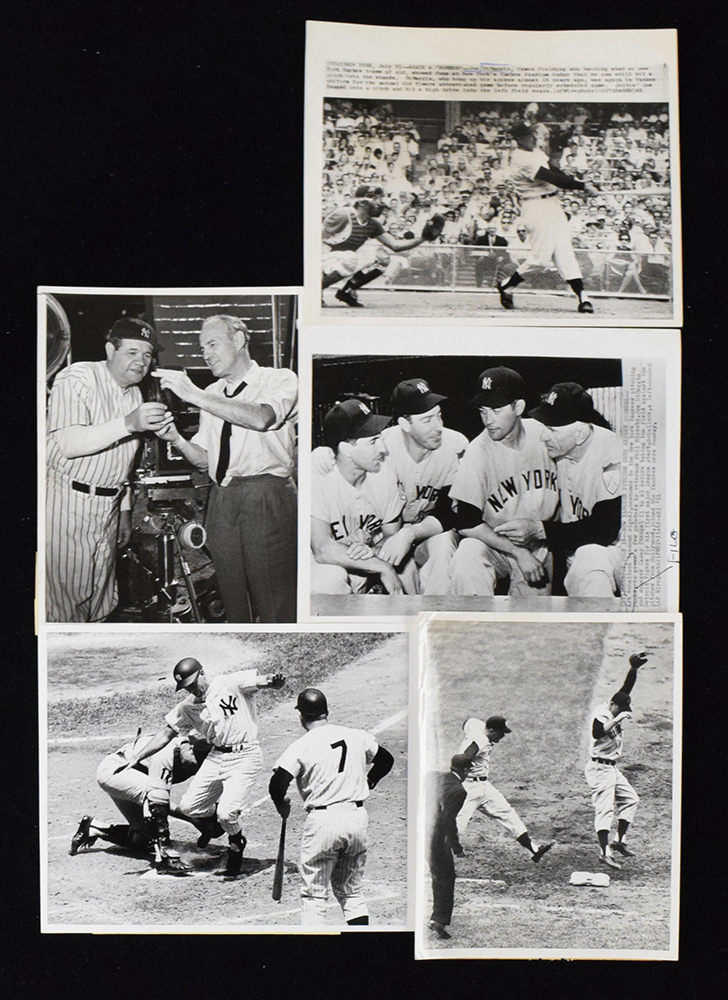 Description:Lot of (5) New York Yankees HOFers photographs, c.1941-1965 (VG-NM). Includes 7"x9" c.1941 Babe Ruth photo by ACME (VG); 8"x10" c.1951 AP photo picturing Casey Stengel, Phil Rizzuto, Joe DiMaggio, and Art Schallock (VG/EX); 7"x9" c.1956 United Press photo picturing Mickey Mantle beating out an infield single (VG/EX); 8"x10" c.1965 UPI photo picturing Mantle watching Bobby Richardson get tagged out at home (EX/MT-NM); and 8"x10" c.1965 AP photo picturing DiMaggio homering during Old Timers Game (EX/MT).