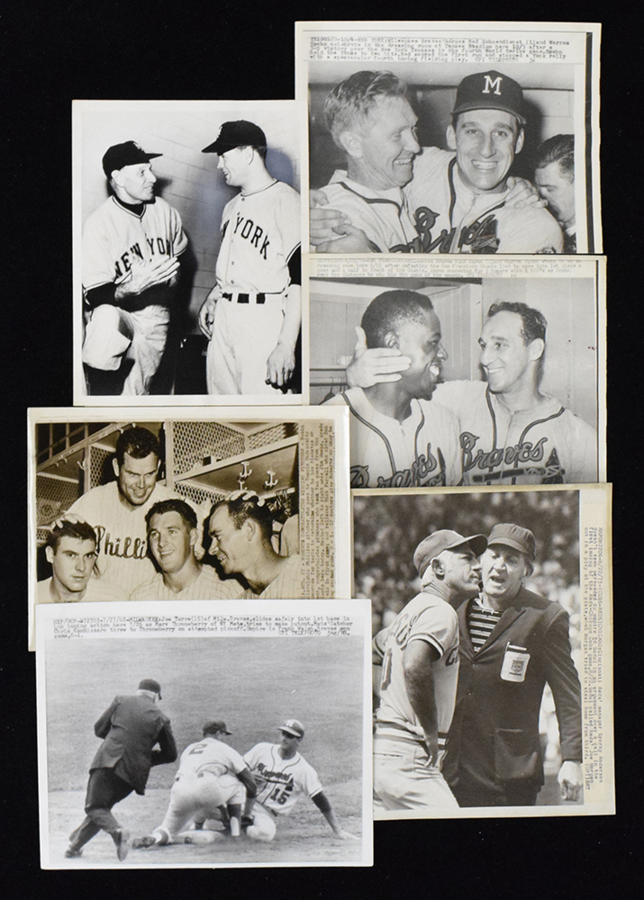 Description:Lot of (9) vintage baseball photographs picturing HOFers, c.1954-1978 (GD-NM). Includes 7"x9" c.1954 Leo Durocher / Paul Giel photo by International News (EX/MT); 7"x9" c.1958 Warren Spahn / Red Schoendienst photo by United Press (EX); 7"x9" c.1959 Warren Spahn / Hank Aaron photo by UPI (GD); 7"x9.5" c.1959 Associated Press photo picturing Robin Roberts, Jim Owens, Dick Farrell, and Don Crdwell (VG/EX); 8"x10" c.1962 UPI photo picturing Joe Torre sliding back into 1st base (VG/EX); 8"x10" c.1965 UPI photo picturing Lou Brock crashing into Chris Cannizzaro to score on an inside the park HR (EX); 8"x10" c.1973 UPI photo picturing Johnny Bench tagging out Randy Hundley (VG/EX-EX); 8"x10" c.1973 UPI photo picturing Sparky Anderson arguing with Ed Sudol (EX); and 8"x10" c.1978 Johnny Bench photo by UPI (EX/MT-NM).