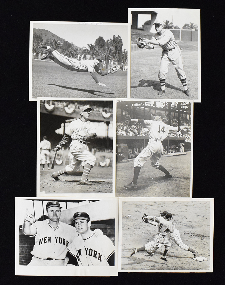 Description:Lot of (19) vintage baseball photographs, c.1930-1972 (FR/GD-NM). Mix of individual and multi-player images. Players include Johnny Mize, Vince DiMaggio, Schoolboy Rowe, Sam Leslie, Jim Ripple, Woody English, Les Fleming, Buddy Rosar, Vern Stephens, Elmer Valo, Clyde Vollmer, Dom DiMaggio, Al Dark, Paul Giel, Gene Mauch, Sammy White, Harry Chiti, Dick Brown, Johnny Callison, Jimmy Hall, Mudcat Grant, Earl Battey, Rocky Colavito, Zoilo Versalles, Johnny Goryl, Bob Allison, Emmett Ashford, Joe DiMaggio (1972 stamped photo of 1941 hitting streak image). Most appear to average VG/EX overall with normal age/handling wear. Range: FR/GD-NM