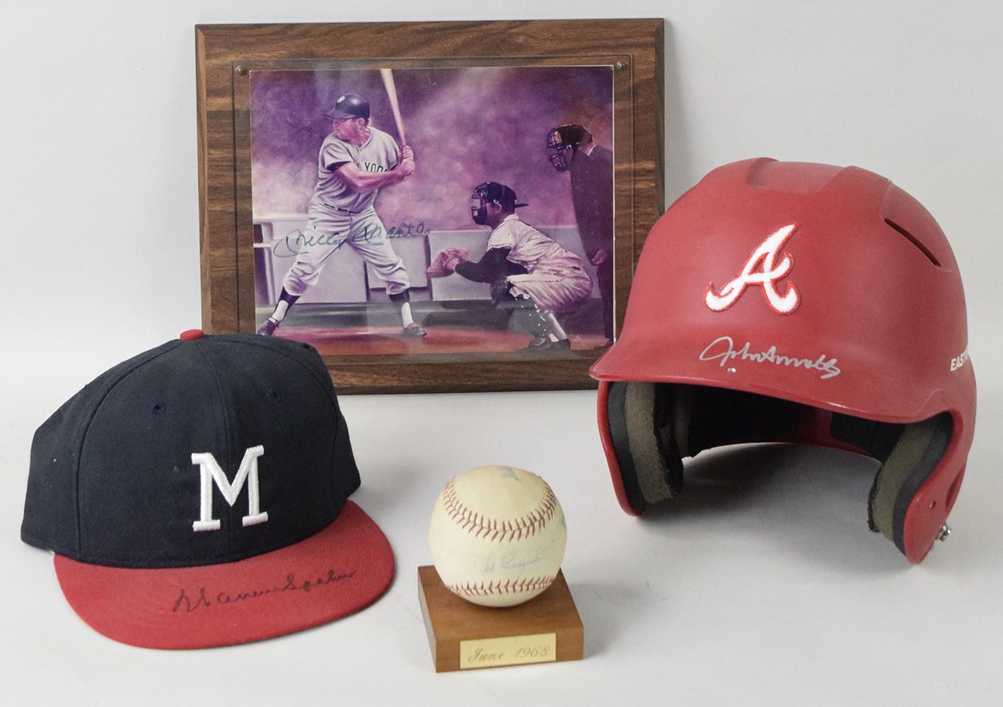 Description:Baseball stars and HOFers autograph lot including Mantle (VG/EX-NM). Includes 10.5"x13" plaque containing a photo signed by Mickey Mantle; Roman "Cooperstown Collection" size 6-7/8 Milwaukee Braves hat signed by Warren Spahn; Easton batting helmet signed by John Smoltz (JSA); and an unlabeled ball signed on the sweet spot by Ted Kluszewski with other names and writing on the side panels (attached to a wooden base). Signatures rate 7 to 9 out of 10: VG/EX-NM