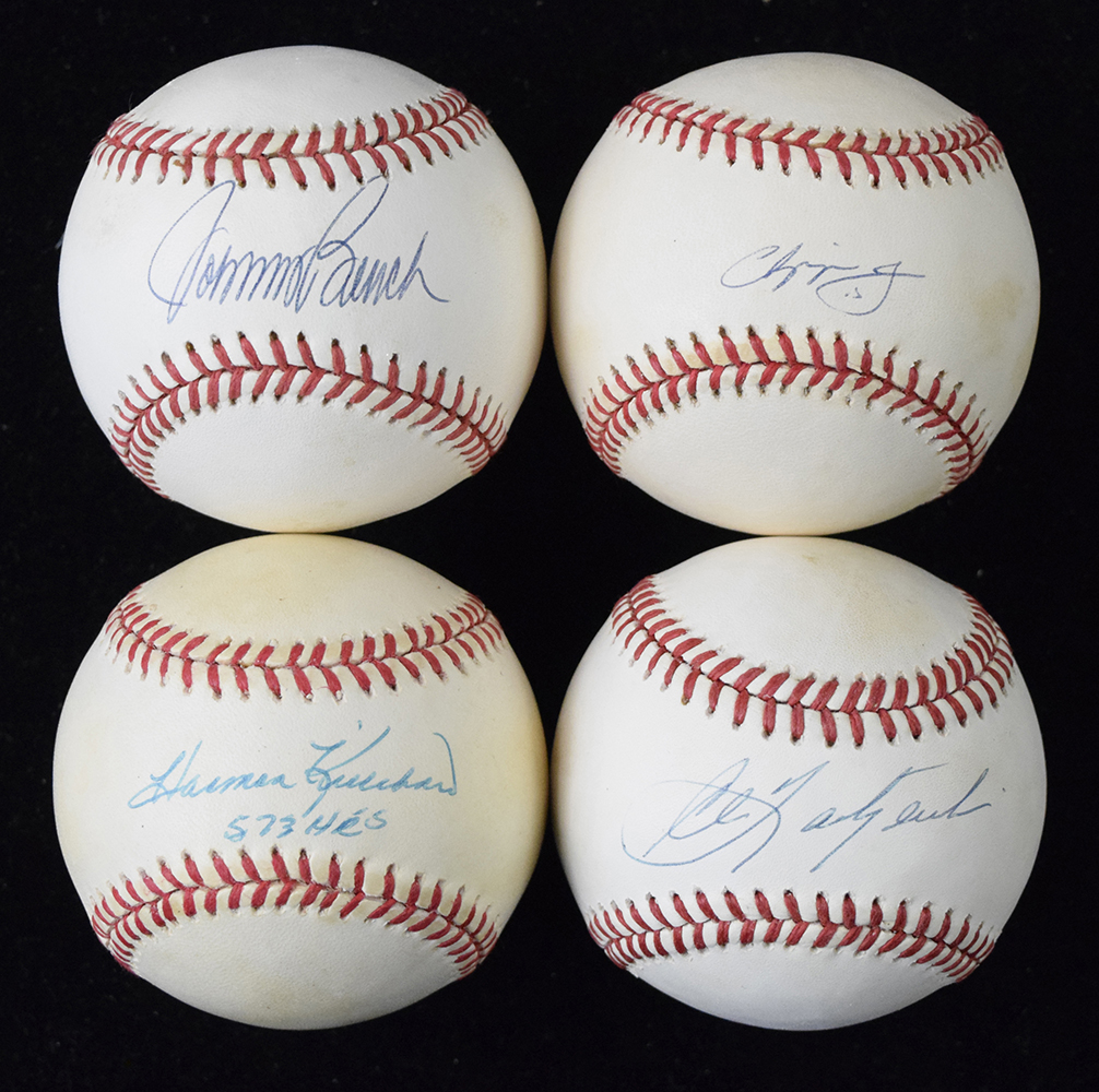 Description:Harmon Killebrew, Johnny Bench, Carl Yastrzemski, Chipper Jones signed baseballs (EX-EX/MT). Includes G.Budig AL ball (toning) signed by Harmon Killebrew with "573 HR's" inscription, W.White NL ball (light toning) signed by Johnny Bench, B.Brown AL ball (toning) signed by Carl Yastrzemski, and L.Coleman NL ball (light toning) signed by Chipper Jones. Signatures rate 8 to 9 out of 10: EX-EX/MT