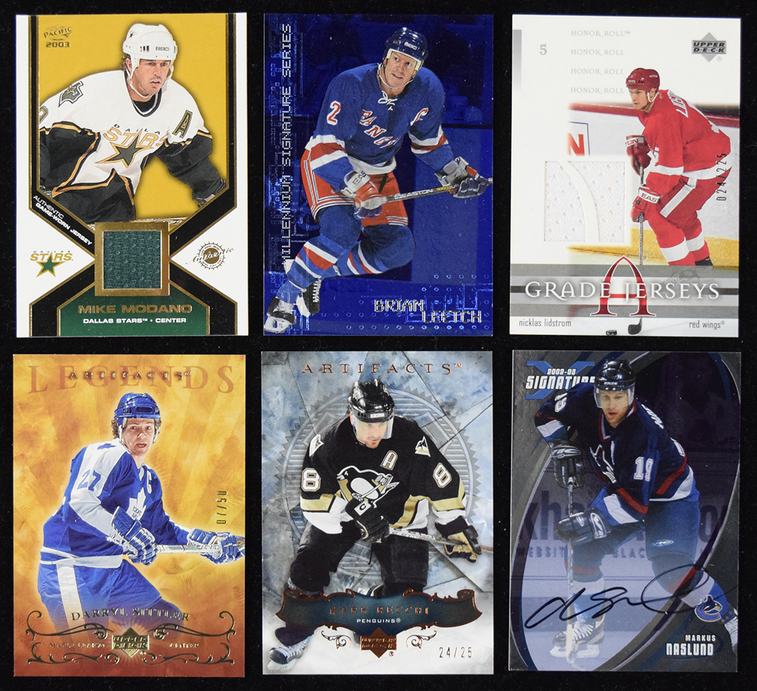 Description:Lot of nearly (300) signed, relic, and serial #ed hockey cards (NM overall). Includes (48) signed insert cards: Markus Naslund, John Bucyk, Wade Redden, Kimmo Timonen, Pavol Demitra, Tobias Enstrom, Ondrej Pavelec, Roman Turek, Ryan Carter, Drew Miller, Anson Carter, Valeri Zelepukin, Joni Pitkanen, and others; (49) relic swatch insert cards: Mike Modano, Mark Recchi, Nicklas Lidstrom, Jarome Iginla, Markus Naslund, Zdeno Chara, Saku Koivu, Vincent Lecavalier, Jordan Staal, Doug Weight, Tony Amonte, Derian Hatcher, Brian Gionta, Theoren Fleury, Frans Nielsen, Miroslav Satan, and others; Approx. (200) cards #ed to 100 or less: Guy Lafleur, Bobby Orr, Johnny Bucyk, Luc Robitaille, Paul Kariya, Ed Belfour, Mark Recchi, Pavel Bure, Teemu Selanne, Grant Fuhr, Brian Leetch, Denis Potvin, Joe Mullen, Sergei Federov, Ron Francis, Scott Niedermayer, Nicklas Lidstrom, Adam Oates, Brendan Shanahan, Peter Forsberg, Ted Lindsay, Denis Savard, Darryl Sittler, Al MacInnis, Jarome Iginla, Alexander Mogilny, Henrik Zetterberg, Alexei Yashin, Joe Thornton, Bob Nystrom, Glenn Anderson, Doug Wilson, Vincent Lecavalier, Henrik Zetterberg, Terry O'Reilly, and others: NM overall