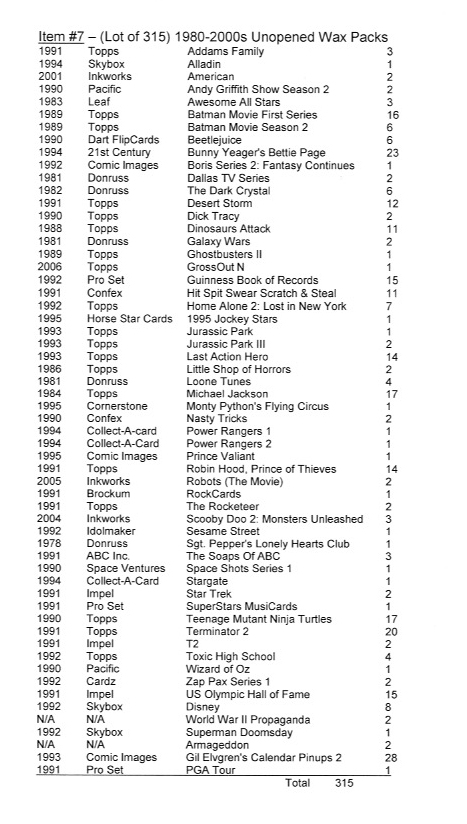 Lot of (315) wax packs from 1978-2006 - mainly non-sports (NM overall). See photo for complete list.