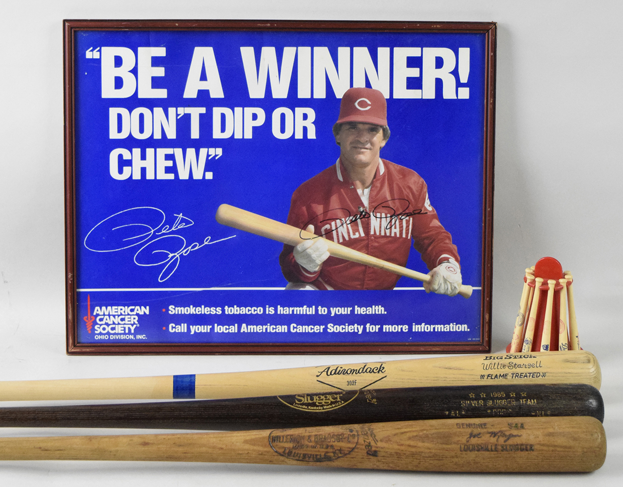 Description:Lot of assorted baseball memorabilia, cards, and autographs (VG-NM). Includes (34) 1970 Fleer World Series cards (VG-EX/MT, avg VG/EX overall); c.1970s Louisville Slugger bank (VG/EX-EX); c.1960s Louisville Slugger 16" Roberto Clemente mini bat (VG/EX-EX); c.1970s 34" Adirondack 302F Willie Stargell store model bat (EX/MT-NM); c.1970s 33" Louisville Slugger S44 Joe Morgan store model bat (VG/EX-EX); c.1970s Louisville Slugger 22" Johnny Bench mini bat (VG/EX-EX); 35" Louisville Slugger 1985 Silver Slugger Team bat (VG surface wear); 18"x23" framed American Cancer Society poster signed by Pete Rose in black marker rating 8 out of 10 (creases visible); Wilson Major League Specifications ball (toning) signed by Lash LaRue in black marker rating 8 out of 10; W.White NL ball (used) signed by Marge Schott (personalized and traced over); and a Cal Ripken Jr notepad: VG-NM