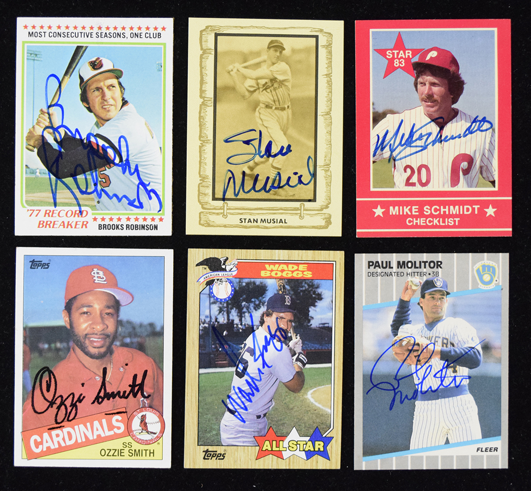 Description:Lot of (35) signed baseball cards from 1960-1998 - mainly stars & HOFers (VG-NM/MT). Includes Stan Musial, Gary Carter, Mike Schmidt, Nolan Ryan, Brooks Robinson, Ozzie Smith, Wade Boggs, Roberto Alomar, Tom Glavine, Paul Molitor, Craig Biggio, Tim Raines, Larry Walker, Randy Johnson, Frank Thomas, Pedro Martinez, Ivan Rodriguez, Chipper Jones, Roger Clemens, Manny Ramirez, Andy Pettitte, Curt Schilling, Don Mattingly, Jose Canseco, Darryl Strawberry, Fernando Valenzuela, Roger Craig, Fred Whitfield, Jim "Mudcat" Grant, Dwight Gooden, John Romano, Larry Brown, Jeff Torborg, dual-signed Cal Ripken Jr / Mike Boddicker, and dual-signed Jim Price / Luke Walker. Signatures rate 7 to 10 (avg 8/9) out of 10. Most cards appear to average EX/MT-NM overall. Range: VG-NM/MT
