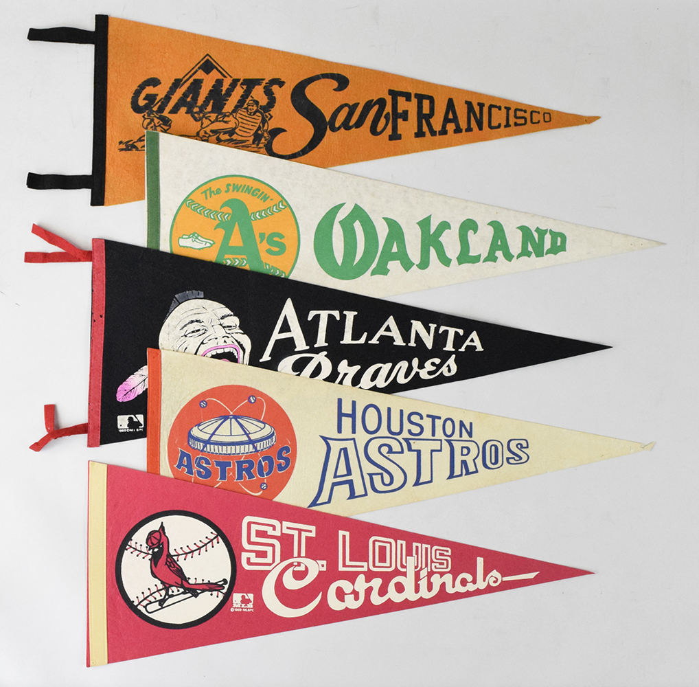 Description:Lot of (10) baseball and basketball pennants, c.1960s-1983 (VG-NM). Are full size pennants. Includes c.1960s San Francisco Giants, c.1969 Atlanta Braves, c.1969 Houston Astros, c.1969 St. Louis Cardinals, c.1969 New York Knicks, (3) different c.1970s The Swinging Oakland A's, and (2) Baltimore Orioles 1983 World Series. Most appear to average VG/EX-EX overall due to various degrees of handling/storage wear. Range: VG-NM