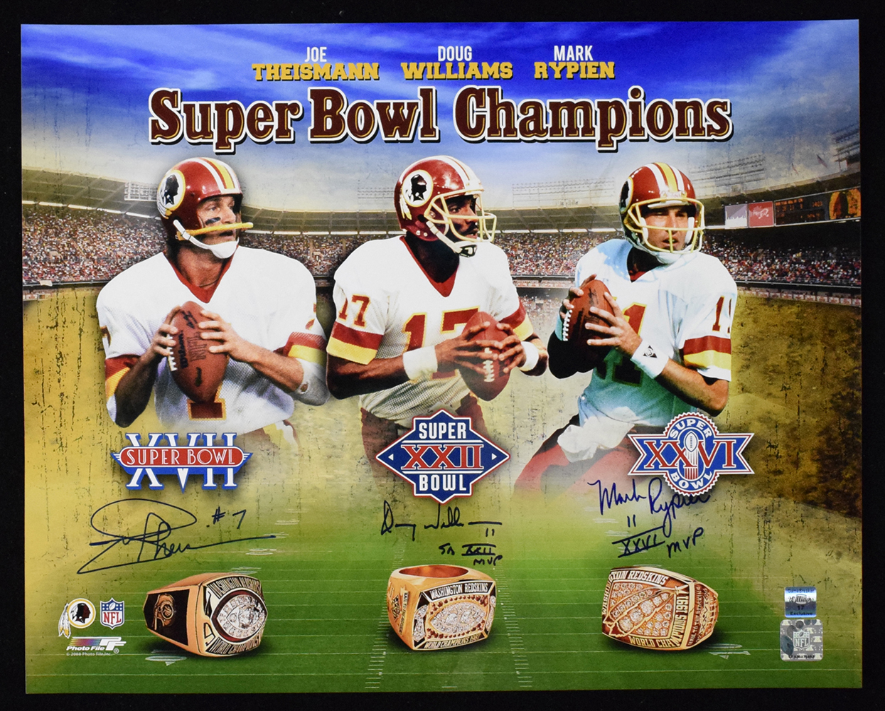 Description:Redskins S.Bowl Champion Quarterbacks signed 16"x20" photograph (NM) Signed by Joe Theisman, Doug Williams, and Mark Rypien in marker rating 9/10 out of 10: NM