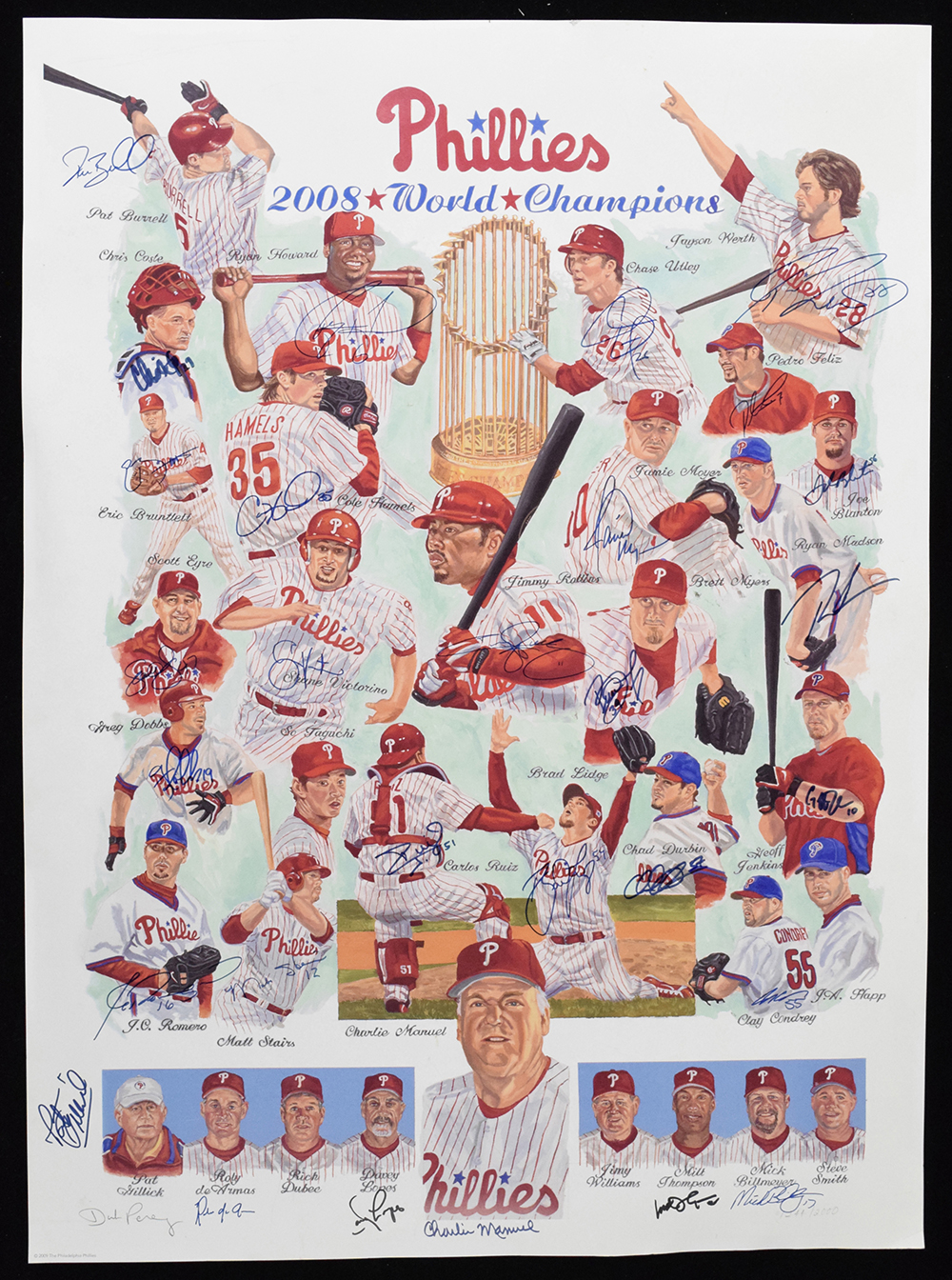 Description:2008 Philadelphia Phillies team signed "World Champions" limited edition Dick Perez print (Sigs. NM, Print EX/MT) Limited edition (numbered out of 2,000) large format 23"x31.5" print has been signed by (29) incl. Howard, Utley, Rollins, Werth, Burrell, Hamels, Victorino, Stairs, Gillick, Manuel, and others. Marker signatures rate 8 to 9/10 out of 10. Touch of light wear to print which would have little, if any, effect when the piece is matted and framed for display: Sigs. NM, Print EX/MT ($500-$1,000)