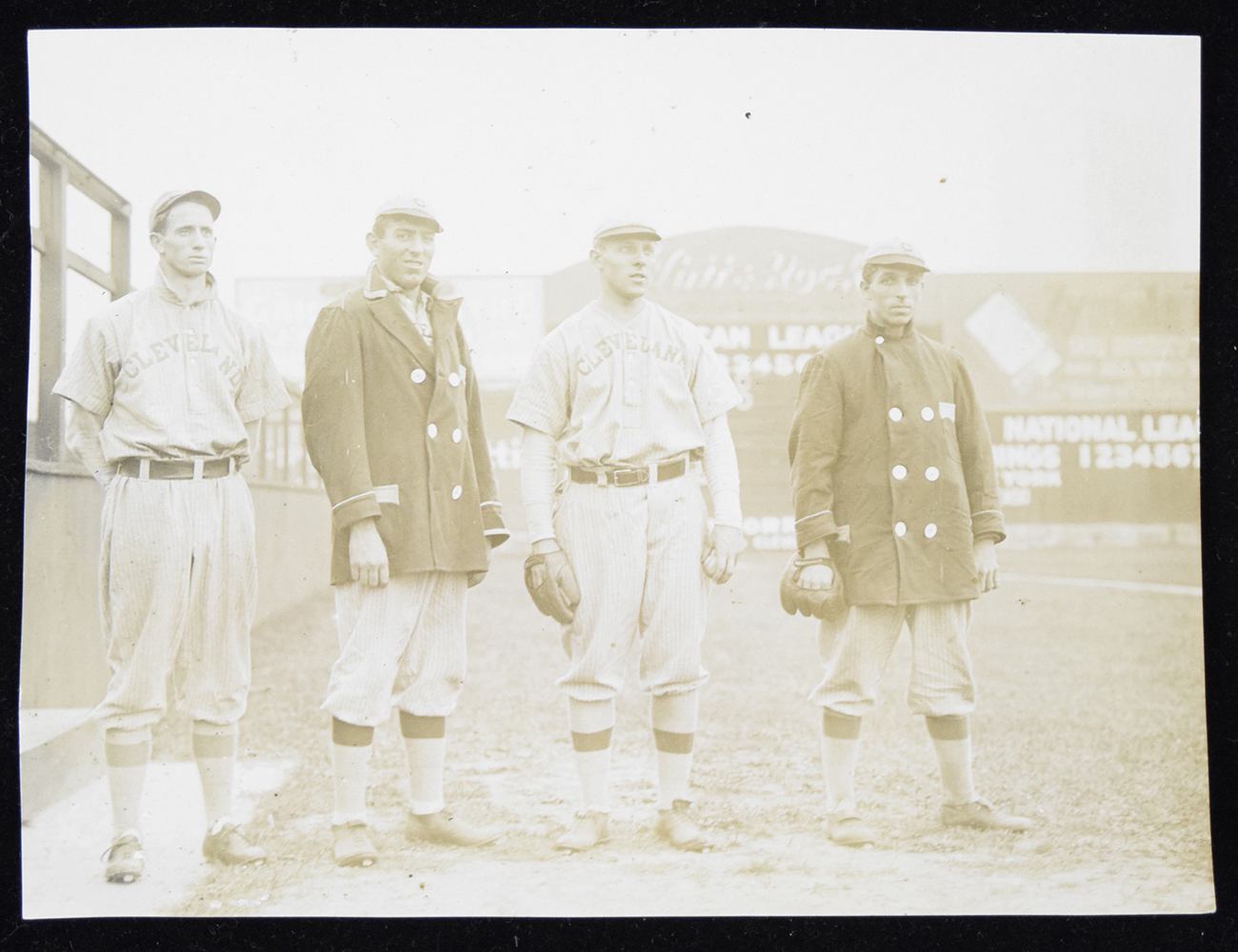 Description:"New Cleveland Pitchers" photograph by Paul Thompson, c.1909 (EX/MT). Approx. 4.75"x6" photo picturing Walt Doan, Jerry Upp, Harry Otis, and Harry Ables. Paul Thompson stamping on the back, along with written identification: EX/MT