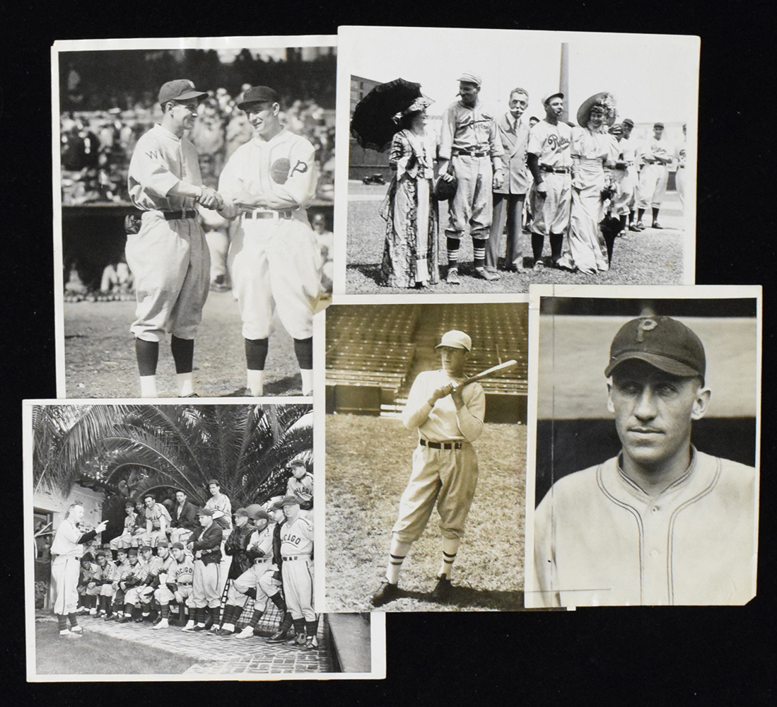 Description:Lot of (5) Baseball HOFers vintage photographs, c.1925-39 (GD-EX). Includes 8"x10" c.1925 International News photo picturing Bucky Harris and Bill McKechnie shaking hands before Game 1 of the World Series (GD), 6"x8" c.1927 Kiki Cuyler photo by Fotograms (G/VG-VG), 6.5"x8" c.1929 Goose Goslin photo (G/VG), 7"x9" c.1936 International News photo picturing Dizzy Dean with Ford Frick and others celebrating the NL 60th Anniversary (VG-VG/EX), and 7"x9" c.1939 ACME photo picturing Gabby Hartnett speaking to his Chicago Cubs team (EX).