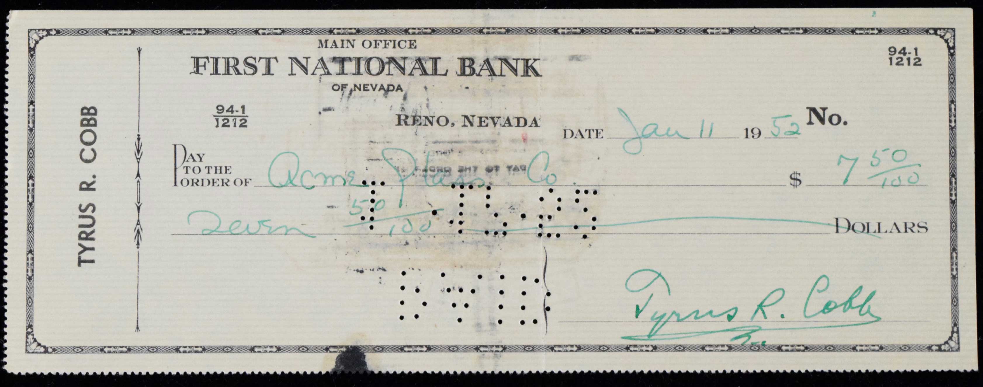 Description:1952 Ty Cobb autographed personal check (Sig. NM, Check EX) January 11, 1952 dated personal check has been signed "Tyrus R. Cobb" at lower right rating 9 out of 10. Typical bank cancellations and a touch of other light wear. Filled out in unknown hand: Sig. NM, Check EX ($750-$1,250)