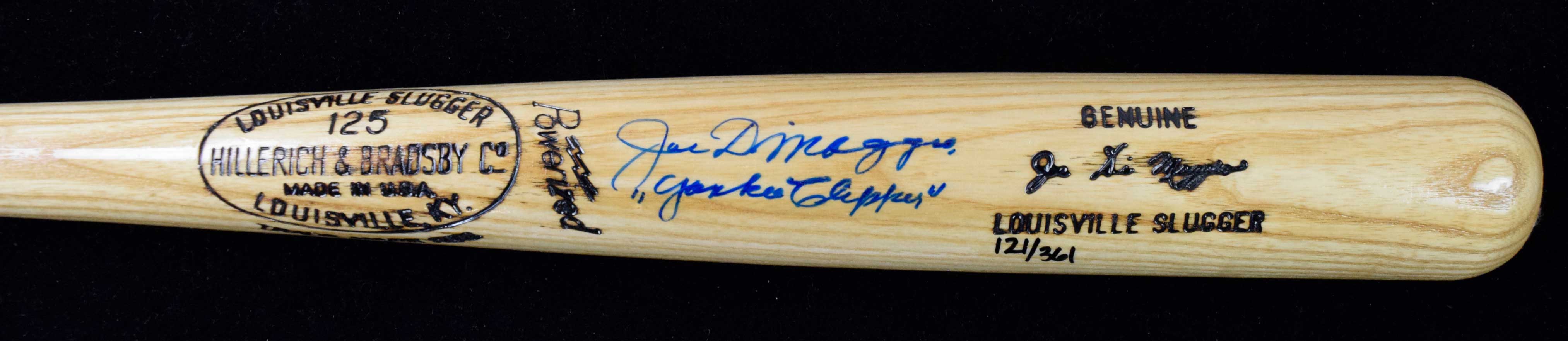Description:Joe DiMaggio autographed limited edition "Yankee Clipper" inscribed baseball bat ("121/361") (Clipper Enterprises COA) (NM) Louisville Slugger 125 model bat done in similar style to that which he would have used has been "Joe DiMaggio Yankee Clipper" in marker rating 8/9 out of 10. Hand numbered "121/361." A Yankee Clipper Enterprises authentication sticker appears on the knob and a corresponding COA is included: NM ($1,000-$1,500)