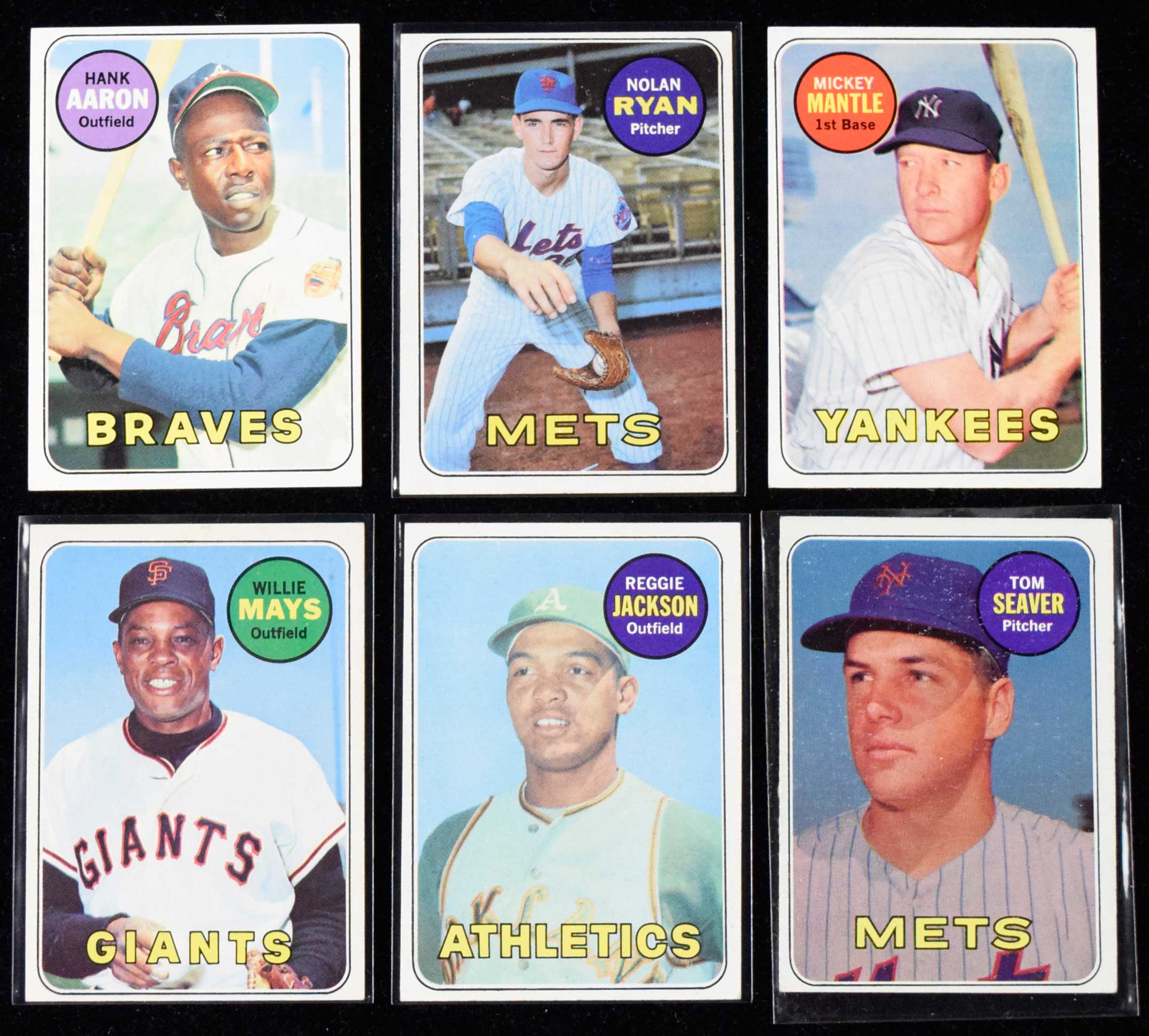 Description:1969 Topps Baseball complete set (664 cards) (Avg. VG/EX) Keys: #20 Banks (VG/EX), 50 Clemente (EX), 85 Brock (EX OC), 95 Bench (VG), 100 Aaron (EX-EX/MT), 120 Rose (EX wax on front), 130 Yastrzemski (VG/EX), 190 Mays (EX), 260 Jackson (EX slightly OC), 480 Seaver (VG), 500 Mantle (EX with a very slight miscut), 510 Carew (GD), 533 Ryan (EX OC), and 597 Fingers (VG/EX-EX OC). Average VG/EX-EX condition throughout with VG-EX/MT general range and only a small portion grading less: Avg. VG/EX ($1,000-$1,500)