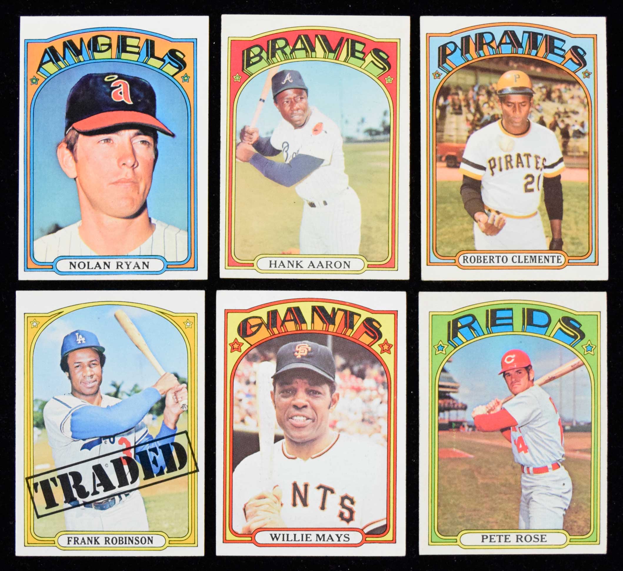 Description:1972 Topps Baseball complete set (787 cards) (Avg. EX) Keys: #49 Mays (EX-EX/MT), 79 Fisk (EX), 299 Aaron (VG), 309 Clemente (VG), 433 Bench (EX/MT OC), 435 Jackson (EX/MT OC), 441 Munson (NM OC), 445 Seaver (EX OC), 550 Robinson (EX), 559 Rose (EX), 595 Ryan (NM OC), 600 Kaline (NM OC), 686 Garvey (VG OC), 695 Carew (EX OC), 751 Carlton (EX/MT OC), 752 Morgan (NM OC), 754 Robinson (NM slightly OC), 761 Oglivie/Cey (VG/EX). Balance are in average EX condition (centering can be an issue) and the general range runs VG-NM (small number lesser): Avg. EX ($750-$1,250)