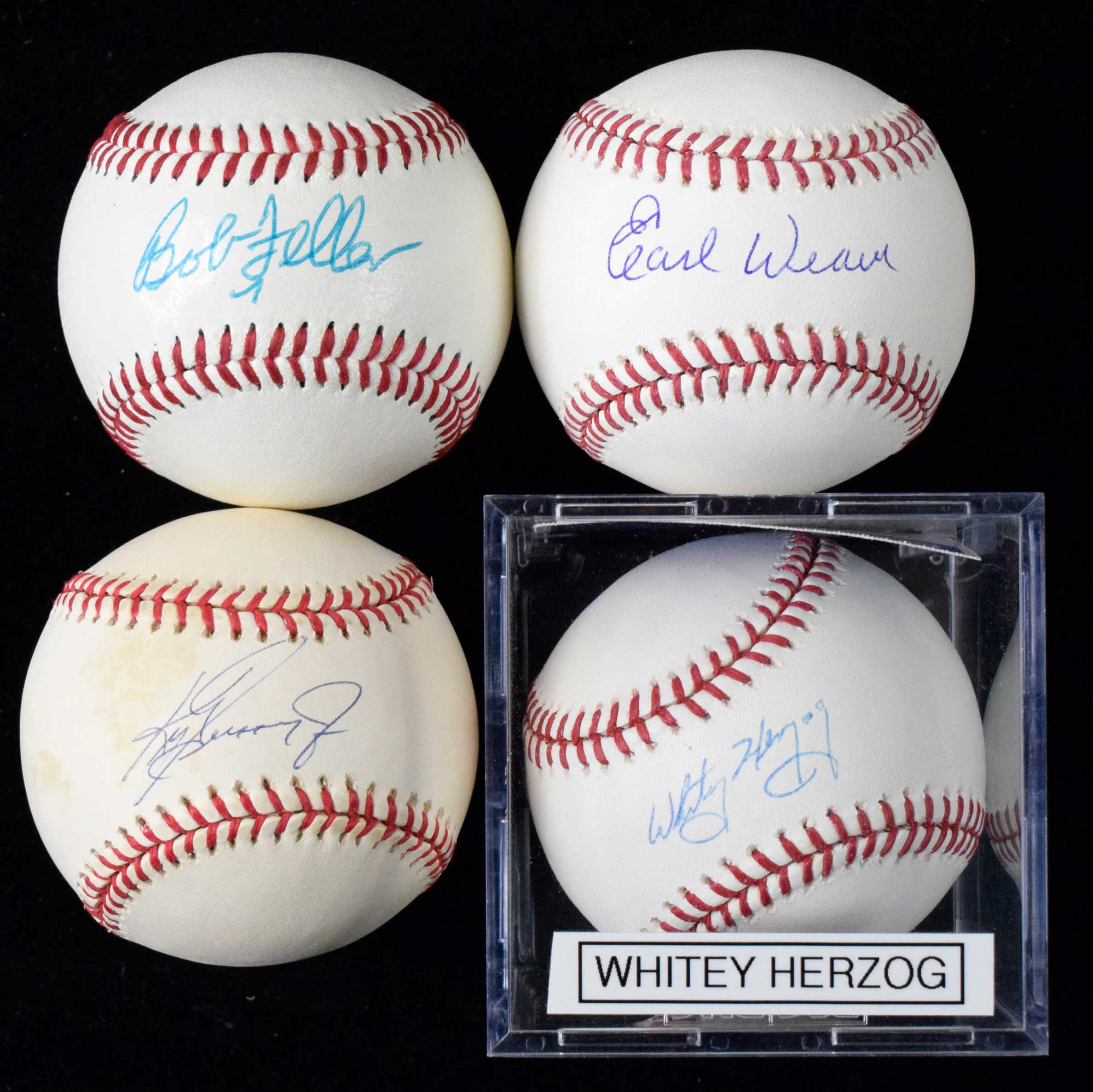 Description:Lot of (5) HOFers signed baseballs (VG-NM/MT). Includes a Wilson Little League ball signed by Bob Feller, G.Budig AL ball (toning) signed by Ken Griffey Jr, B.Brown AL ball (toned) signed by Frank Thomas (fading), B.Selig ML ball signed by Earl Weaver (PSA/DNA), and B.Selig ML ball signed by Whitey Herzog (PSA/DNA). Signatures rate 4/5 (Thomas) to 9/10 (avg 8) out of 10: VG-NM/MT