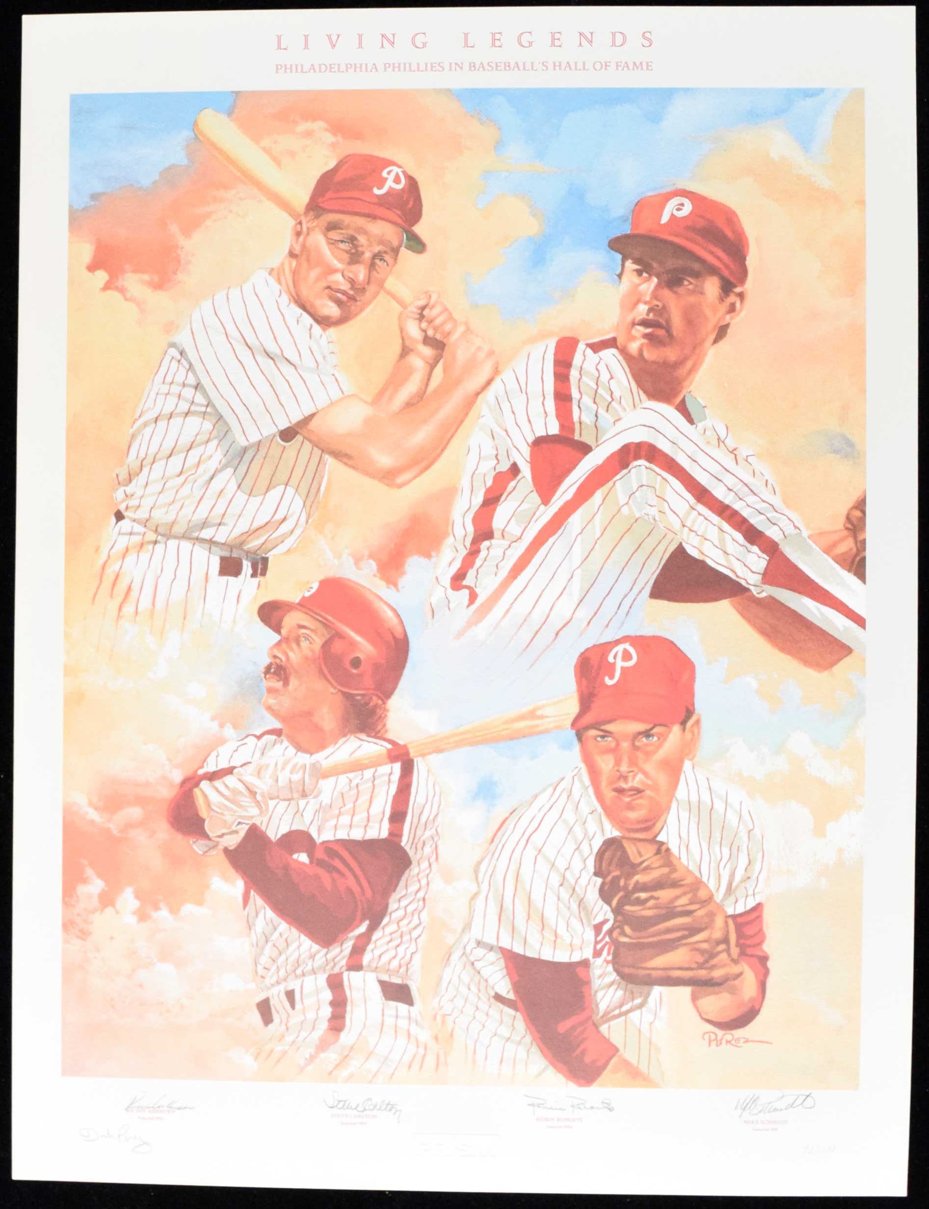 Description:Richie Ashburn, Robin Roberts, Mike Schmidt, Steve Carlton multi-signed limited edition Dick Perez lithograph (NM). Approx. 22"x28" lithograph signed by all four in pencil. Signatures rate 8 to 8/9 out of 10. Also signed by artist Dick Perez, and #ed 73/1000: NM