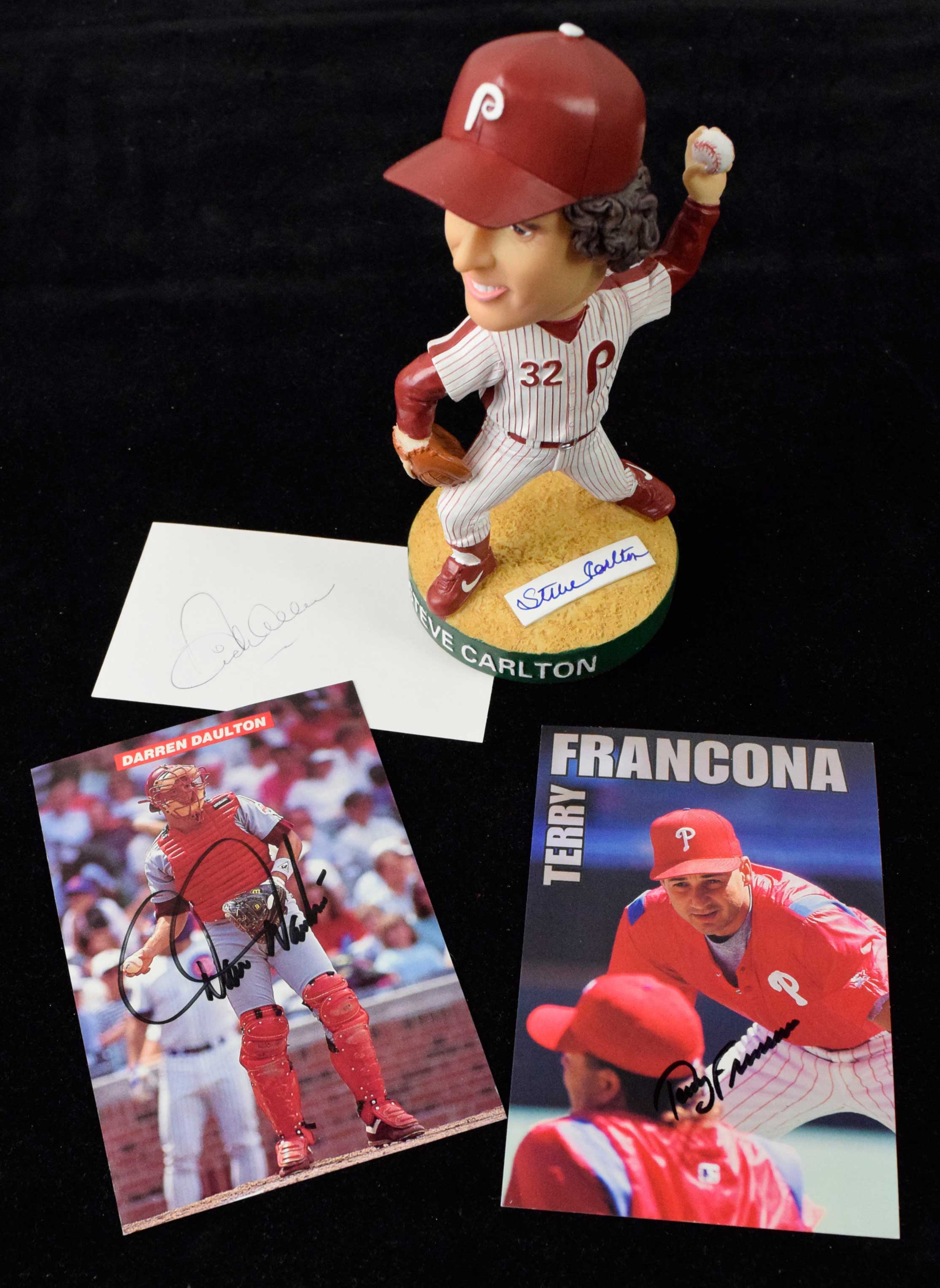 Description:Philadelphia Phillies autograph lot including Carlton signed bobblehead (VG-NM/MT). Includes a stadium giveaway bobblehead signed by Steve Carlton; Index card signed by Dick Allen; (4) signed team issue photo cards: Darren Daulton, Terry Francona, Jim Eisenreich, and Mitch Williams; c.1973-75 34.25" Louisville Slugger K55 Terry Harmon professional model bat signed by Harmon (used, cracked); c.1980-82 36" Adirondack 246X Larry Christenson pro model bat signed by Christenson (unused); c.1989 New Era MLB Authentic Diamond Collection size 7-1/4 Phillies pro model hat signed by Pat Combs; 1992 Upper Deck baseball card signed by Terry Mulholland; and 2001 Upper Deck Victory baseball card signed by Randy Wolf. Signatures rate 6/7 to 10 (avg 8/9) out of 10: VG-NM/MT