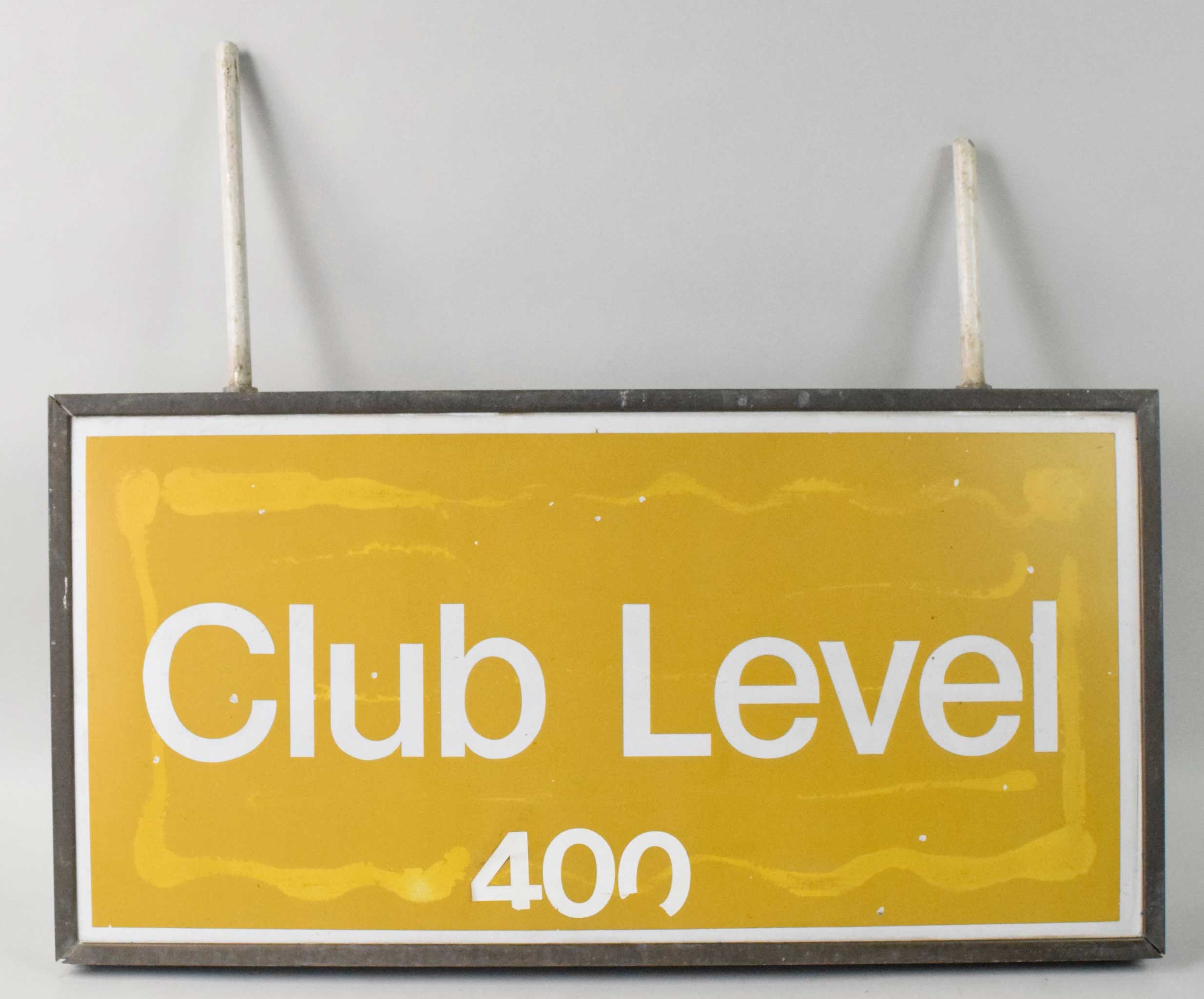 Description:Riverfront Stadium double-sided sign (EX). Measures approx. 28"x37" (including poles for hanging). One side identifies the 400 Club Level, and the other side identifies the 200 Plaza Level. Nomal wear from extensive display, including some peeling to the number decals: EX