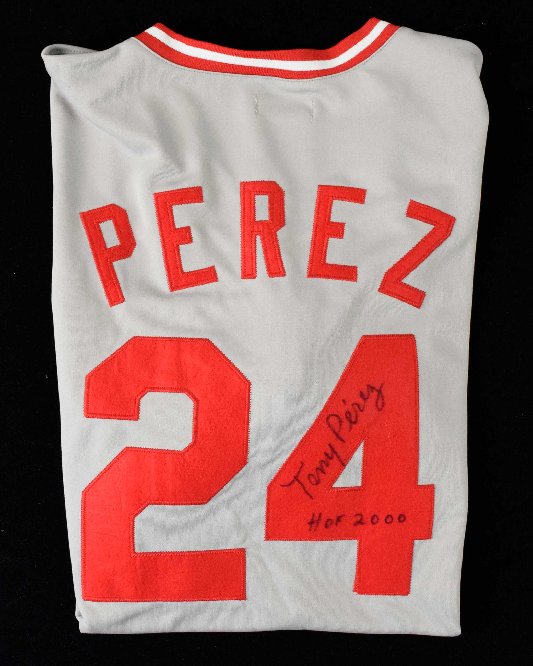 Description:Tony Perez signed and inscribed Cincinnati Reds jersey (NM). Faux Mitchell & Ness size 54 Reds #24 Tony Perez jersey signed by Perez in black marker with "HOF 2000" inscription. Signature rates 8 out of 10: NM