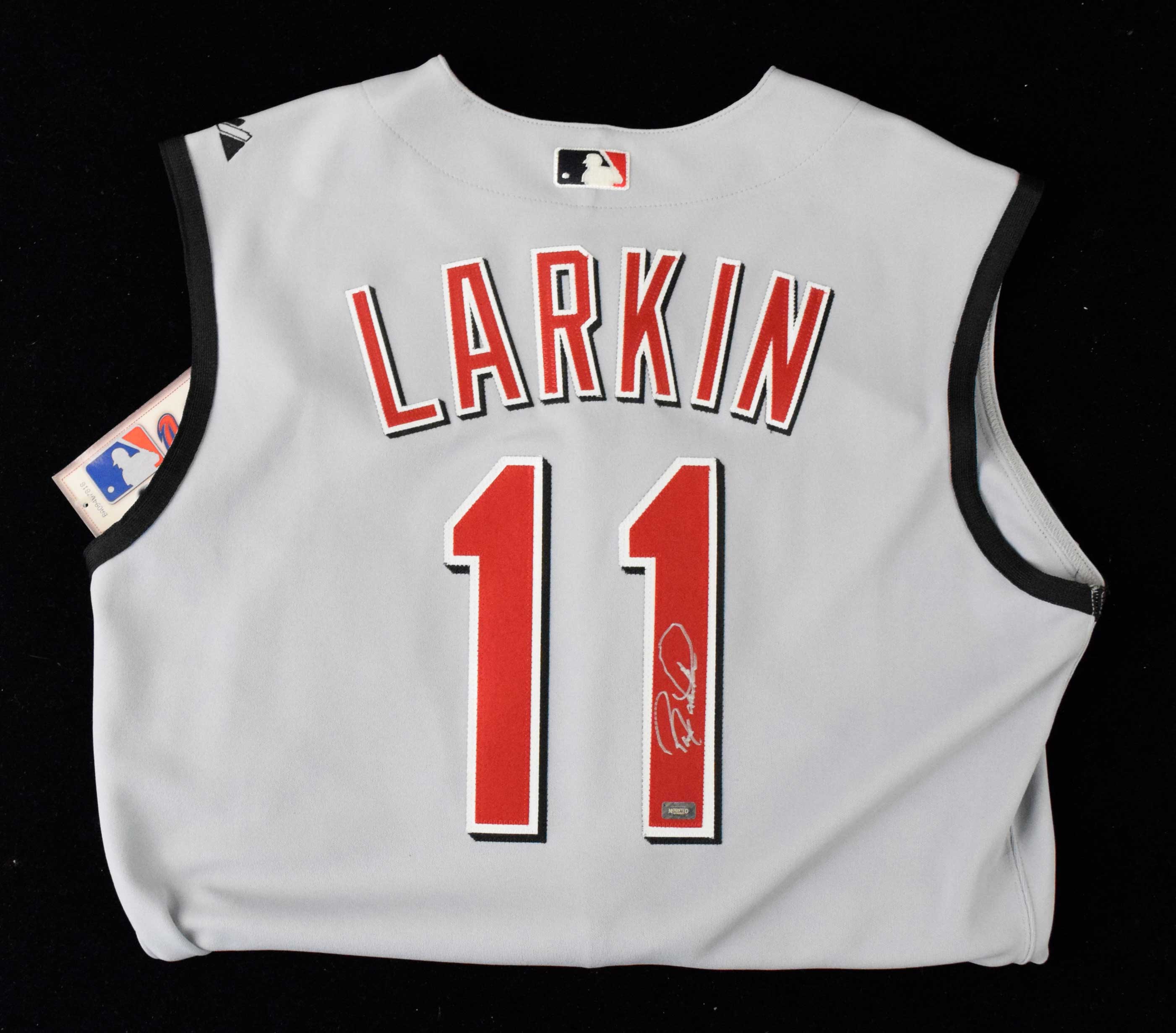 Description:Barry Larkin signed Cincinnati Reds jersey (NM). Majestic size 44 Reds #11 Barry Larkin vest jersey signed by Larkin in silver marker. Signature rates 8/9 out of 10. Mounted Memories serial #ed hologram sticker is on the jersey: NM