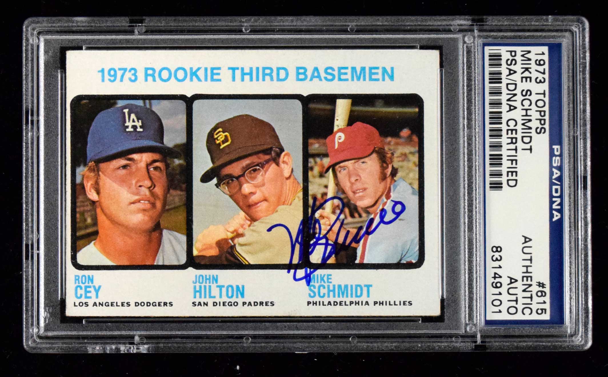 1973 Topps #615 Mike Schmidt autographed Rookie card (PSA) (Sig. NM, Card EX) Signed in marker rating 9/10 out of 10: Sig. NM, Card EX