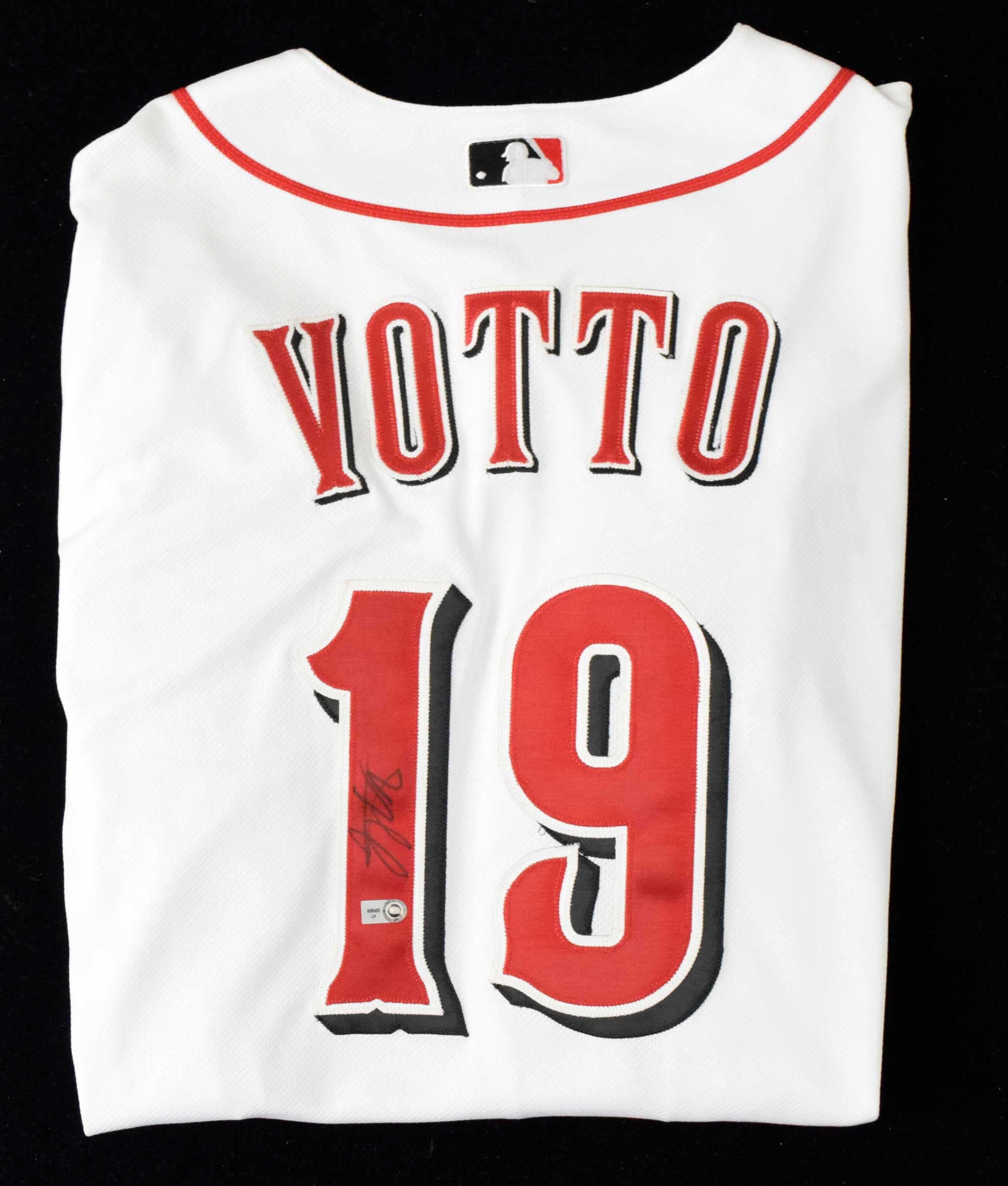 Description:Joey Votto signed Cincinnati Reds jersey - MLB Authenticated (NM). Majestic size 44 Reds #19 Joey Votto jersey signed by Votto in black marker. Signature rates 8 out of 10. MLB Authenticated serial #ed hologram sticker is on the jersey: NM