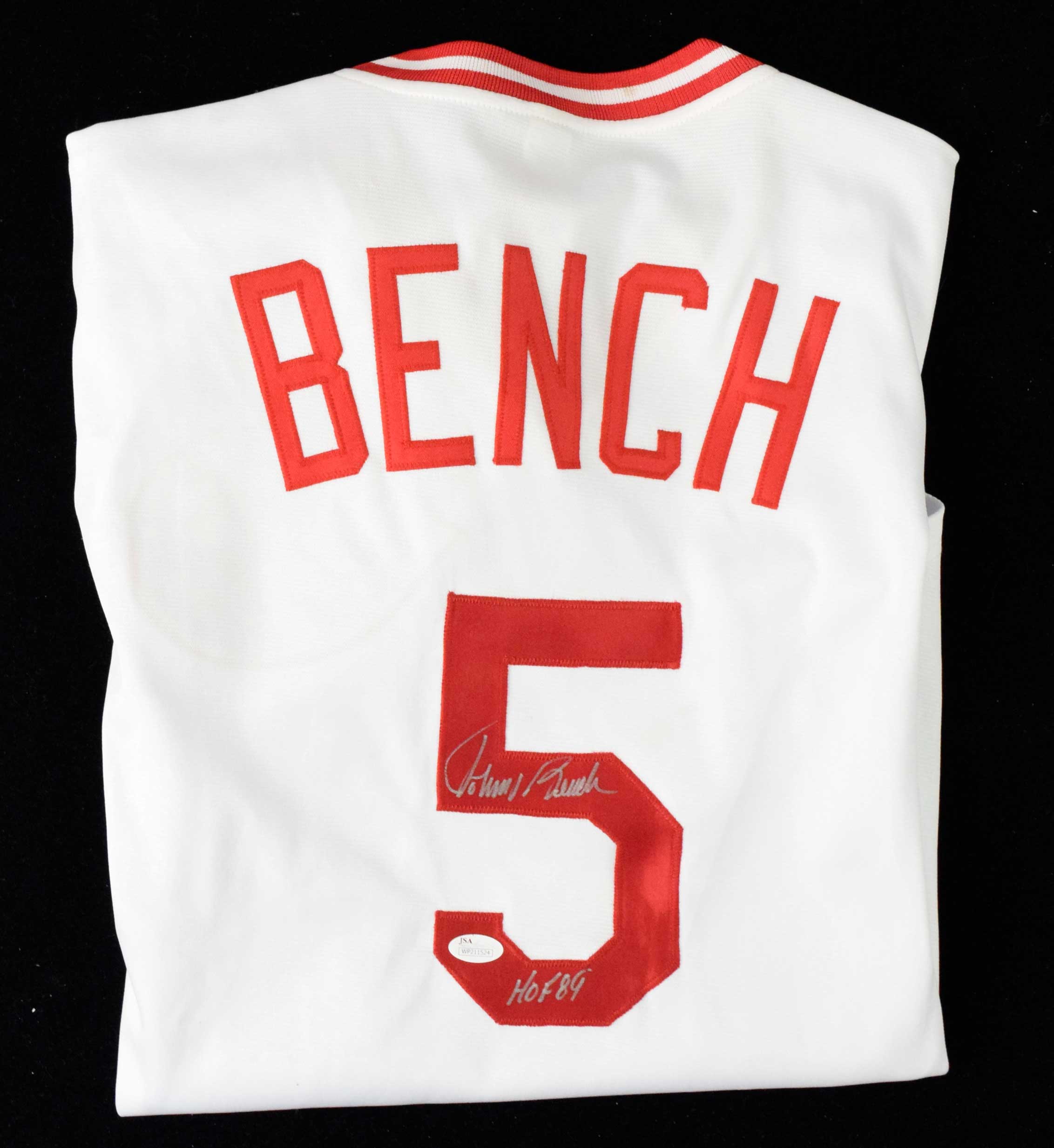 Description:Johnny Bench signed and inscribed Cincinnati Reds jersey - JSA (NM). Size XL Reds #5 Johnny Bench jersey signed by Bench in silver marker with "HOF 89" inscription. Signature rates 8/9 out of 10. JSA serial #ed sticker is on the jersey. No maker tagging: NM