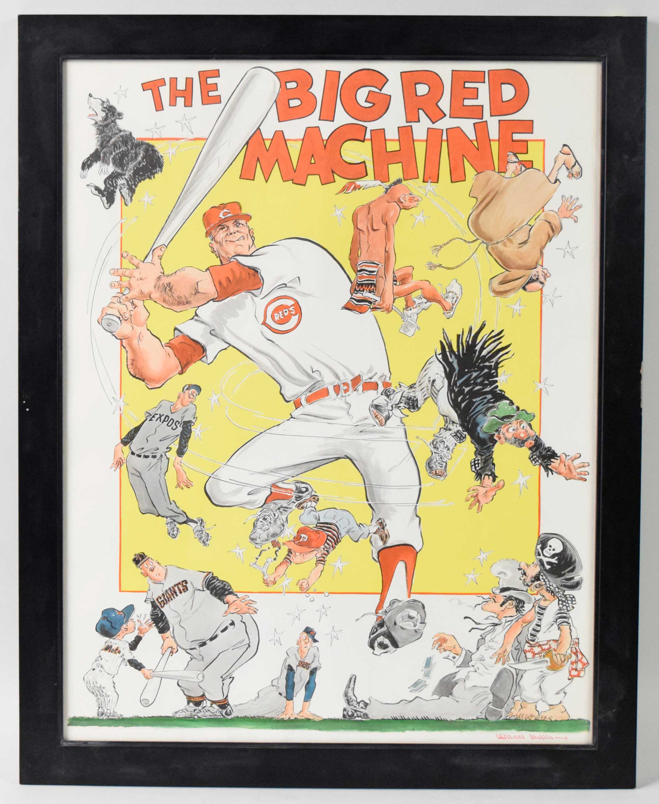Description:Willard Mullin signed Cincinnati Reds "Big Red Machine" framed print (NM). Frame measures approx. 25"x31". Mullin signed the bottom edge of the print in red marker. Signature rates 9 out of 10. Due to framing, complete condition is unknown: NM appearance