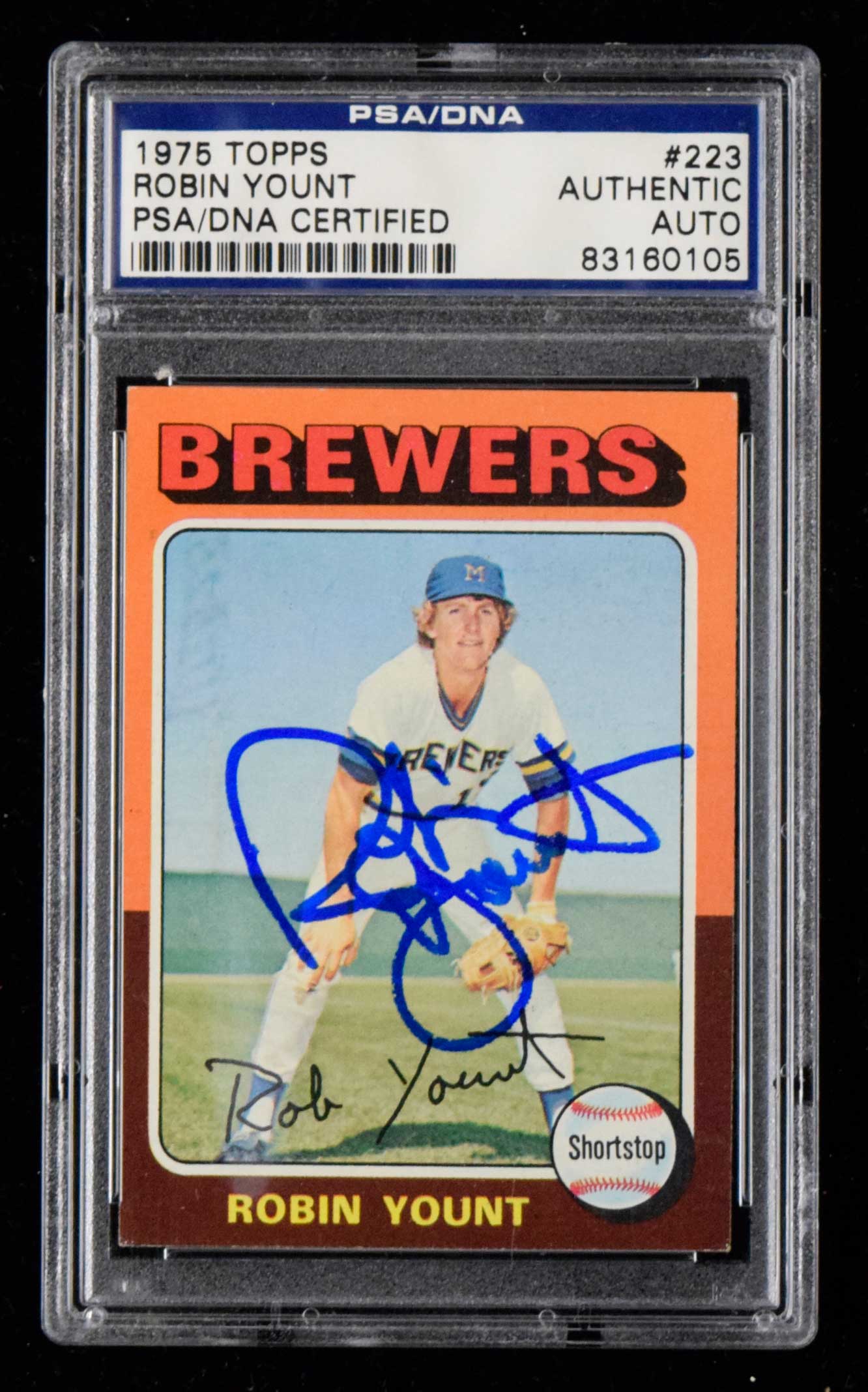 Description:1975 Topps #223 Robin Yount autographed Rookie card (PSA) (Sig. EX/MT-NM, Card EX/MT) Signed in marker rating 8 out of 10: Sig. EX/MT-NM, Card EX/MT