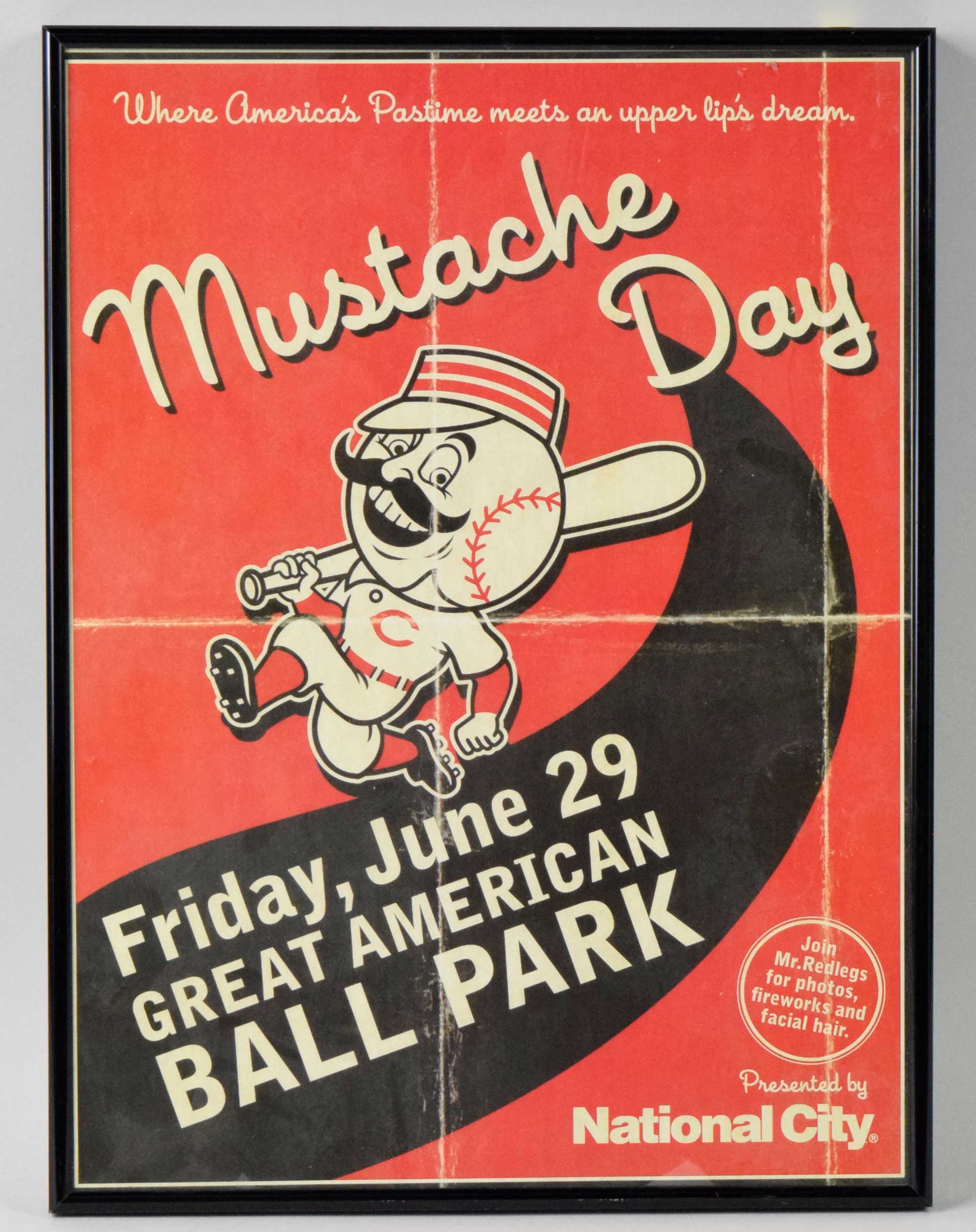 Description:Cincinnati Reds "Mustache Day" print displayed at Great American Ball Park - MLB Authenticated (NM). Approx. 14"x19" framed print encouraging fans to attend the upcoming promotion. MLB Authenticated serial #HZ950221 hologram sticker is on the frame: NM