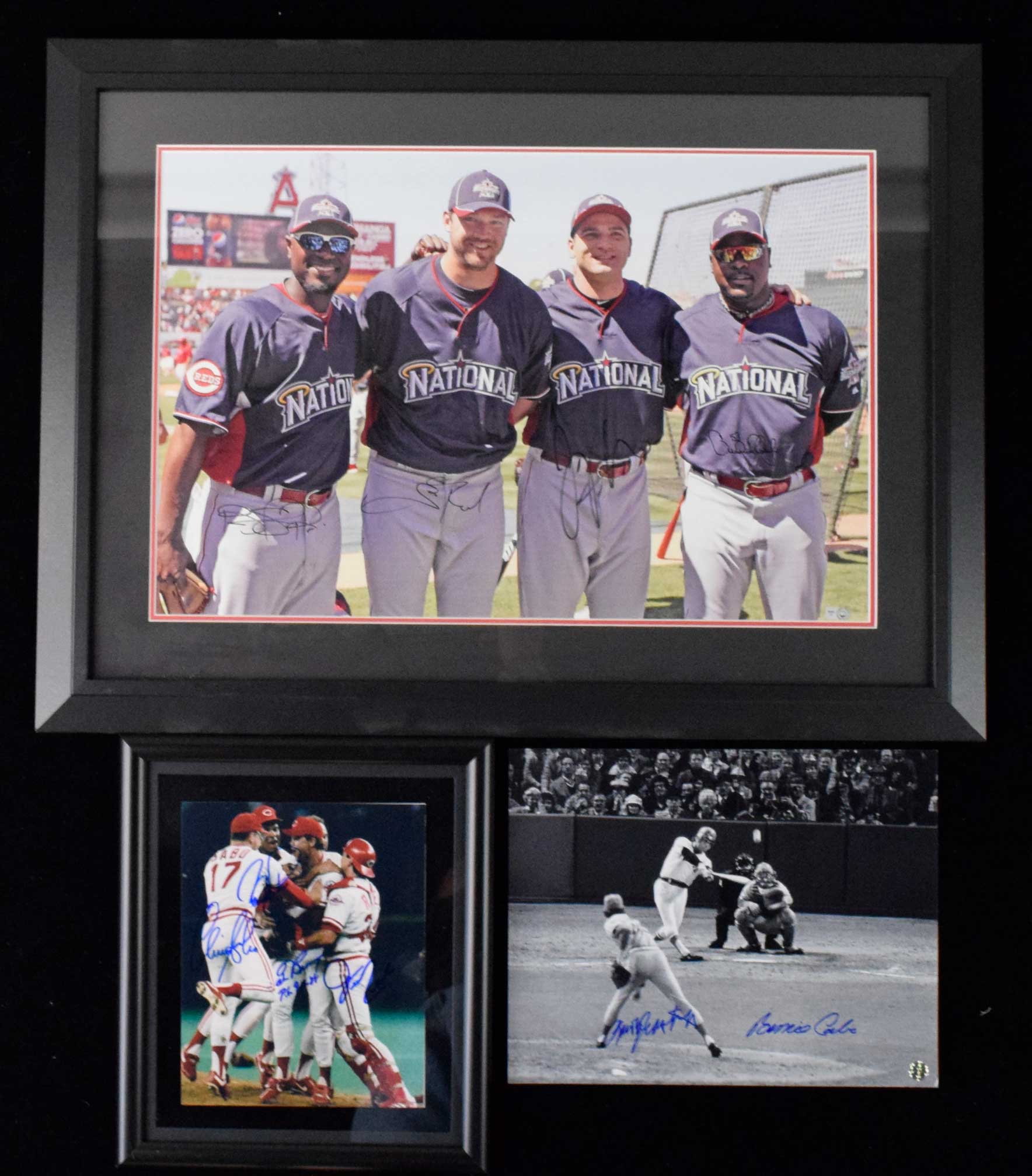 Description:Lot of (5) multi-signed baseball photographs - mostly Cincinnati Reds (NM-NM/MT). Includes 23"x31" framed 2010 NL All-Stars photo multi-signed by Brandon Phillips, Scott Rolen, Joey Votto, and Arthur Rhodes (MLB Authenticated); Framed 8"x10" photo multi-signed by Tom Browning with "P.G. 9-16-88" inscription, Barry Larkin, Chris Sabo, and Joe Oliver; Framed 8"x10" photo multi-signed by Dave Parker, Eric Davis, and Kal Daniels (JSA); Framed 8"x10" Reds pitching staff photo signed by (13): Jim Kaat, Ron Robinson, Ted Power, Tom Browning, John Franco, Bruce Kimm, John Stuper, Joe Price, Bob Buchanan, Andy McGaffigan, Mario Soto, Tom Hume, and Jay Tibbs; 11"x14" photo dual-signed by Bernie Carbo and Rawly Eastwick. Signatures rate 7 to 10 (avg 8/9) out of 10: NM-NM/MT