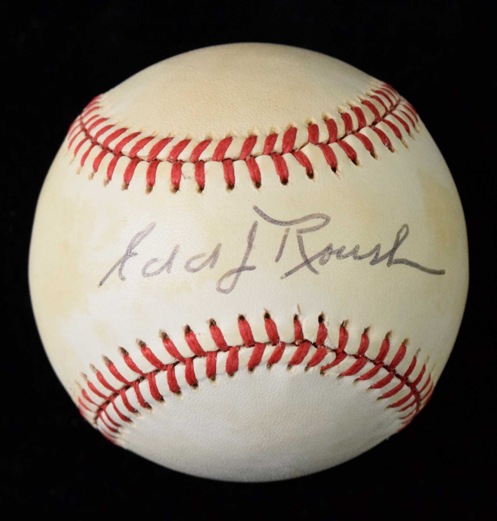 Description:Edd Roush signed C.Feeney NL baseball - PSA/DNA (EX). Roush signed the sweet spot in black ink. Signature rates 8 out of 10. PSA/DNA serial #ed sticker is on the ball. Light to moderate toning on all panels: EX