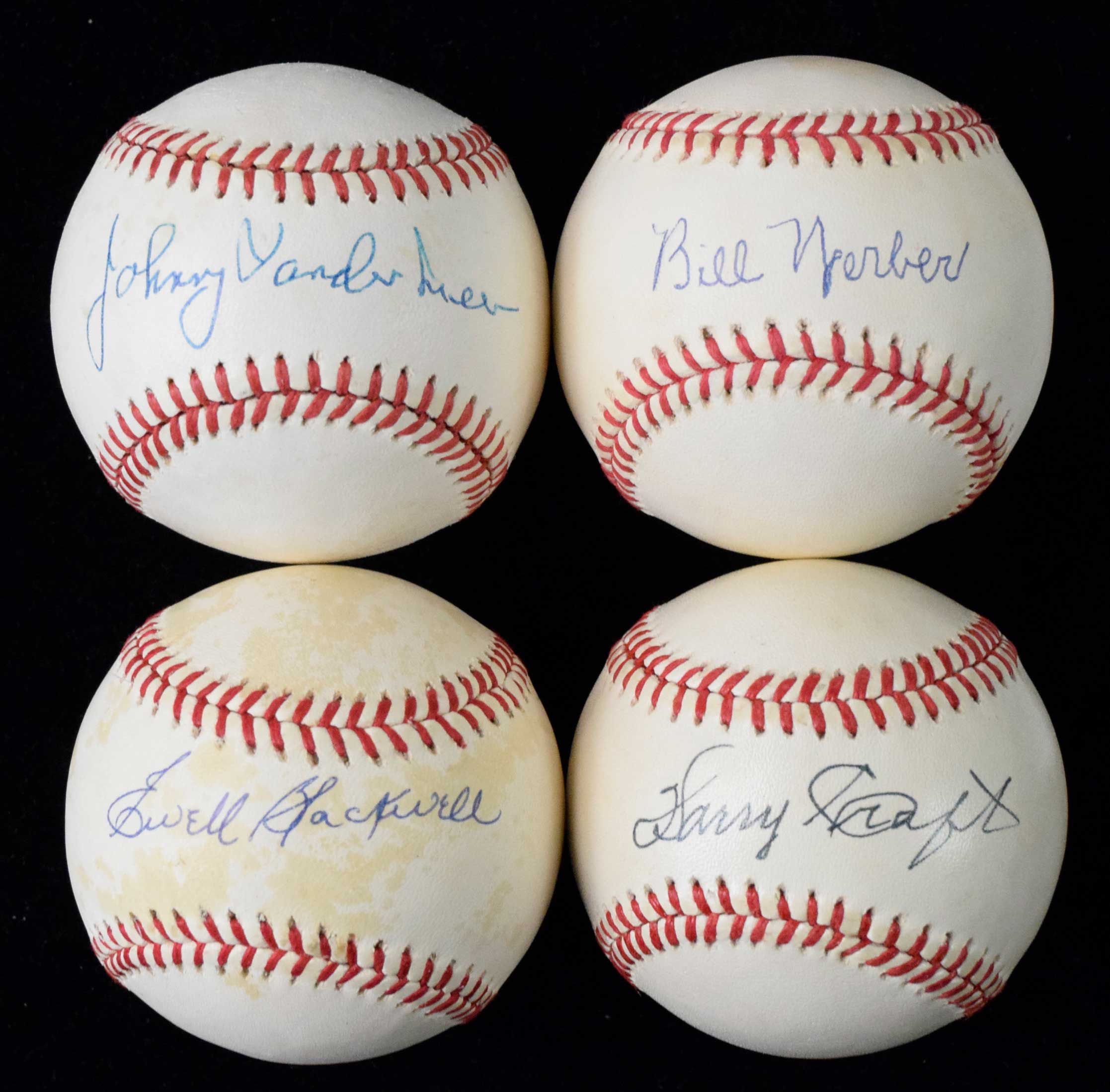 Description:Lot of (5) 1930s-40s era Cincinnati Reds signed baseballs - JSA & PSA/DNA (VG-EX/MT). Includes W.White NL ball (toned) signed by Ewell Blackwell (JSA), B.Brown AL ball (lightly shellacked) signed by Harry Craft (JSA), W.White NL ball (light toning) signed by Lonny Frey (PSA/DNA, personalized to Jimmy), B.Giamatti NL ball (toning) signed by Johnny Vander Meer (JSA), and B.Brown AL ball (light toning) signed by Bill Werber (PSA/DNA). Signatures rate 8 to 9/10 out of 10: VG-EX/MT