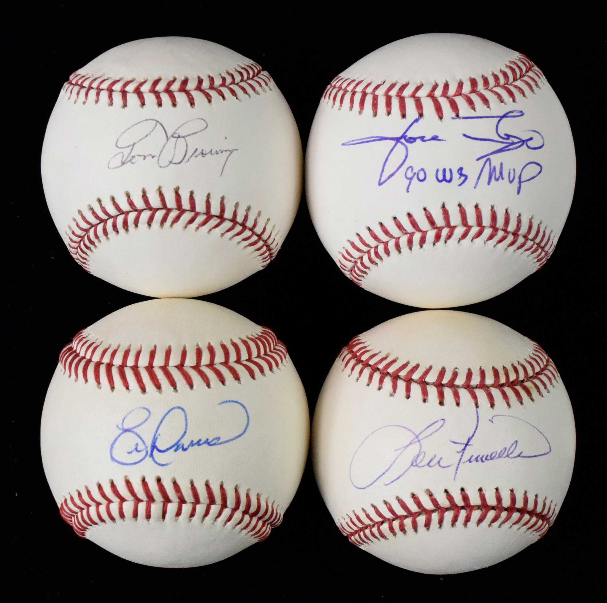 Description:Lot of (9) 1990 Cincinnati Reds signed baseballs (EX/MT-NM/MT). Includes B.Selig ML ball signed by Lou Piniella, Official League ball signed by Eric Davis, B.Selig ML ball signed by Jose Rijo with "90 WS MVP" inscription, B.Selig ML ball signed by Tom Browning, W.White NL ball (light toning) signed by Chris Sabo (PSA/DNA), R.Manfred ML ball signed by Bill Bates with "1990 WS Champs" inscription, Official League ball signed by Billy Hatcher, R.Manfred ML ball signed by Scott Scudder with "1990 WS Champs" inscription, and W.White NL ball signed by Ron Oester (PSA/DNA). Signatures rate 7/8 to 9/10 out of 10: EX/MT-NM/MT