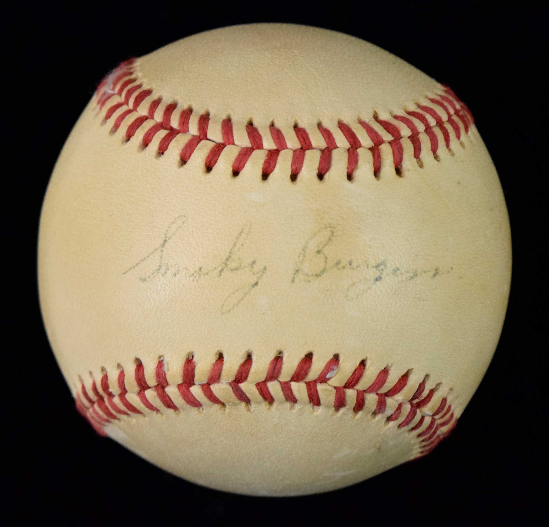 Description:Smoky Burgess signed baseball - SGC Authentic (VG/EX). Staff brand baseball signed by Burgess in black ink. Signature rates 7 out of 10 due to some fading. SGC Authentic serial #ed hologram sticker is on the ball. Even toning on all panels: VG/EX