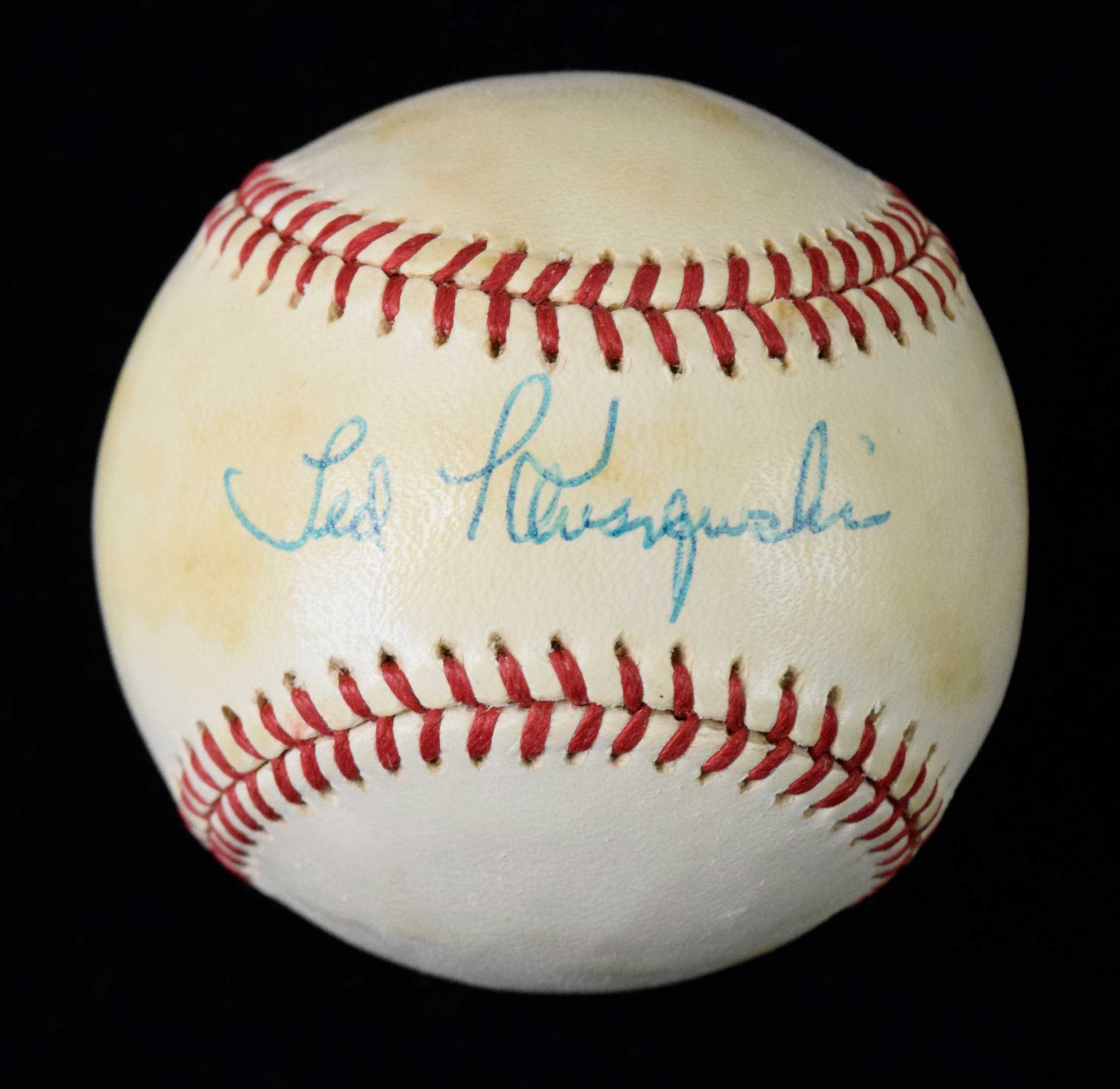 Description:Ted Kluszewski signed L.MacPhail AL baseball - PSA/DNA (EX). Kluszewski signed the sweet spot in blue ink. Signature rates 8/9 out of 10. PSA/DNA serial #ed sticker is on the ball. Lightly shellacked, with some scattered toning: EX