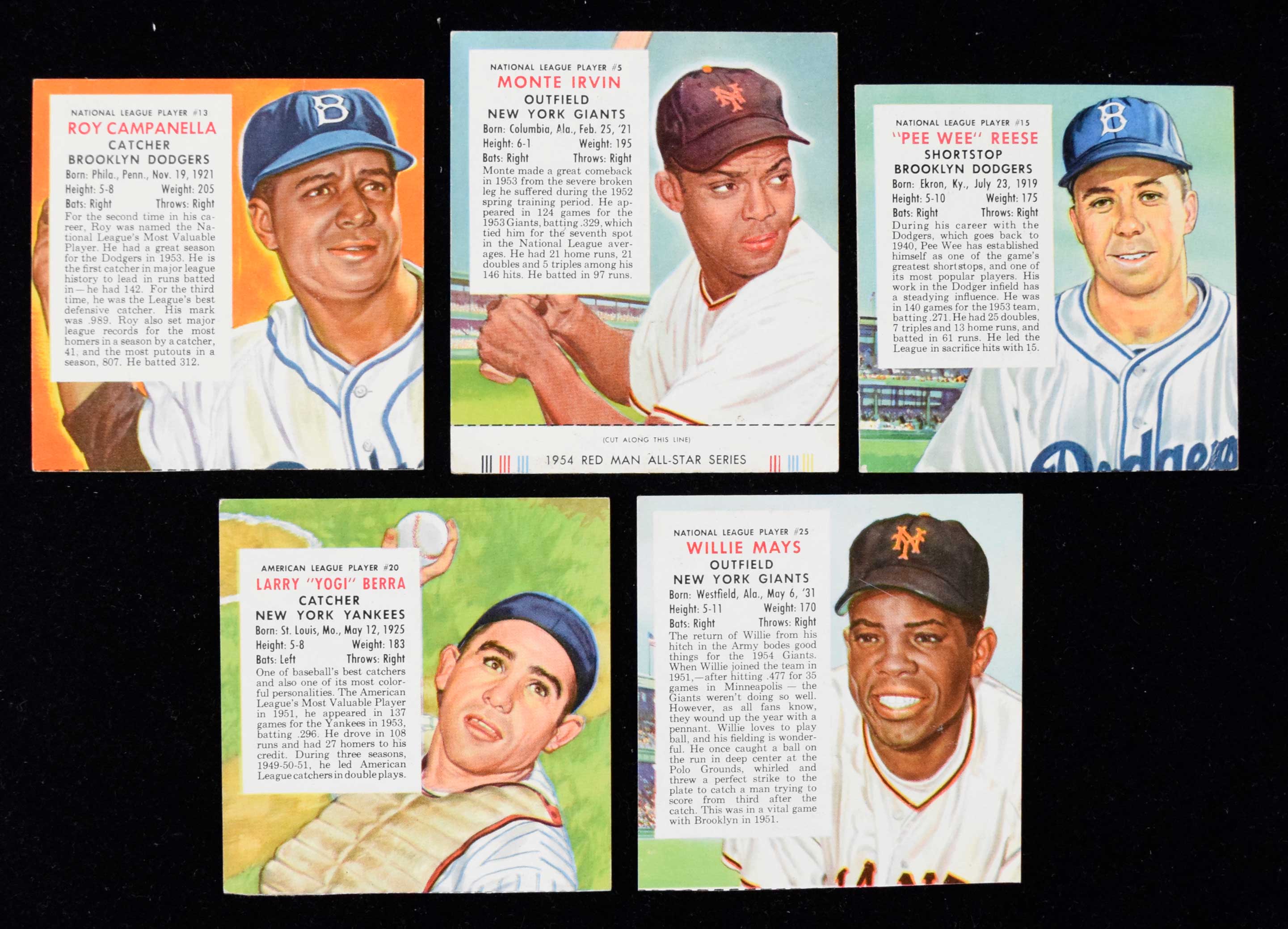 Description:1954 Red Man Tobacco complete set (7 with tabs) (GD-EX) The following have tabs: Lollar, Irvin, Rice, Porterfield, Fain, Delsing, and McDougald. Balance have tabs removed. Average VG condition throughout with GD-EX general range. Keys (all no tab): Campanella (VG), Reese (VG), Ford (VG/EX), Berra (EX), and Mays (VG/EX): GD-EX ($300-$500)